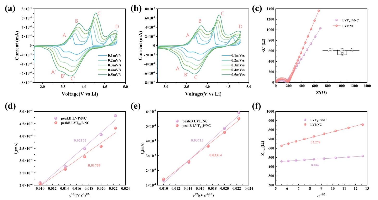 Fig 13 CV curves (0.1~0.5 mV∙s-1) for (a) LVT0.1P/NC; (b) LVP/NC; (c) EIS curves and equivalent circuits for LVT0.1P/NC and LVP/NC; Linear fitting between Ip and v1/2: (d) oxidize process; (e) reduce process;(f) linear fit of Zreal to ω-1/2