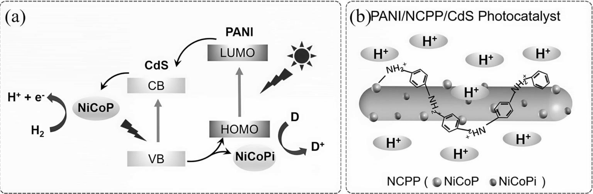 Fig.2 (a) Diagram illustrating charge separation and photocatalytic mechanism;(b) schematic of CdS nanorods loaded with PANI and NCPP[30]