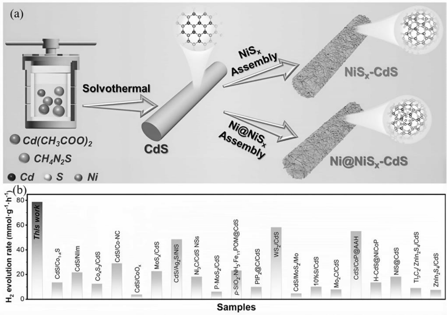 图3 (a)Ni@NiSx-CdS光催化剂的合成过程示意图;(b)不同CdS基光催化剂的析氢速率对比图[29]