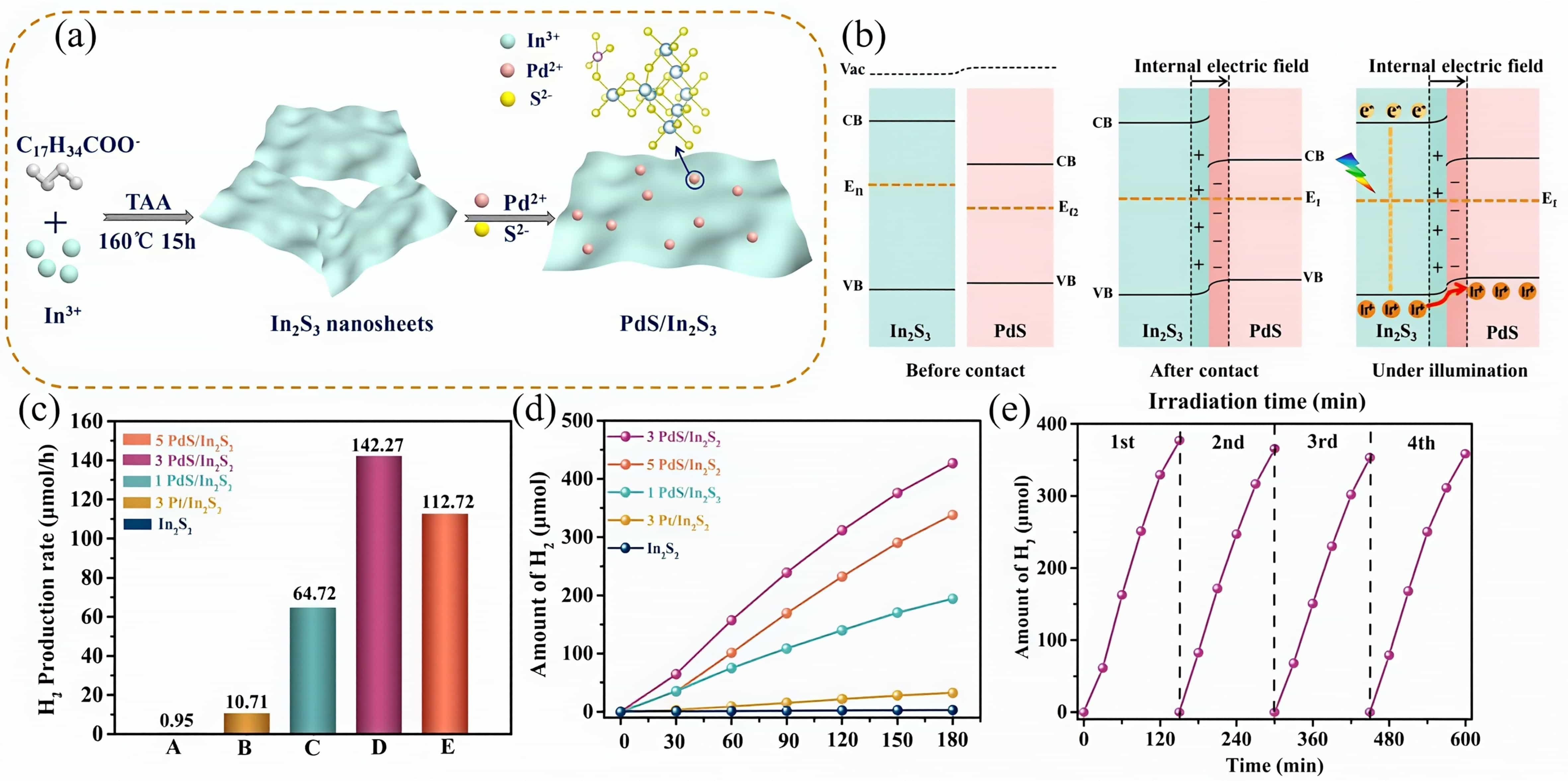 Fig.4 Schematic illustration of (a)the fabrication for PdS/In2S3 catalyst and(b)the internal electric field formation between PdS and In2S3, Comparison of the hydrogen evolution rate (c) and amount of H2 generation(d)for the as-prepared samples;(e)stability test of H2 generation for the 3PdS/In2S3 composite[35]