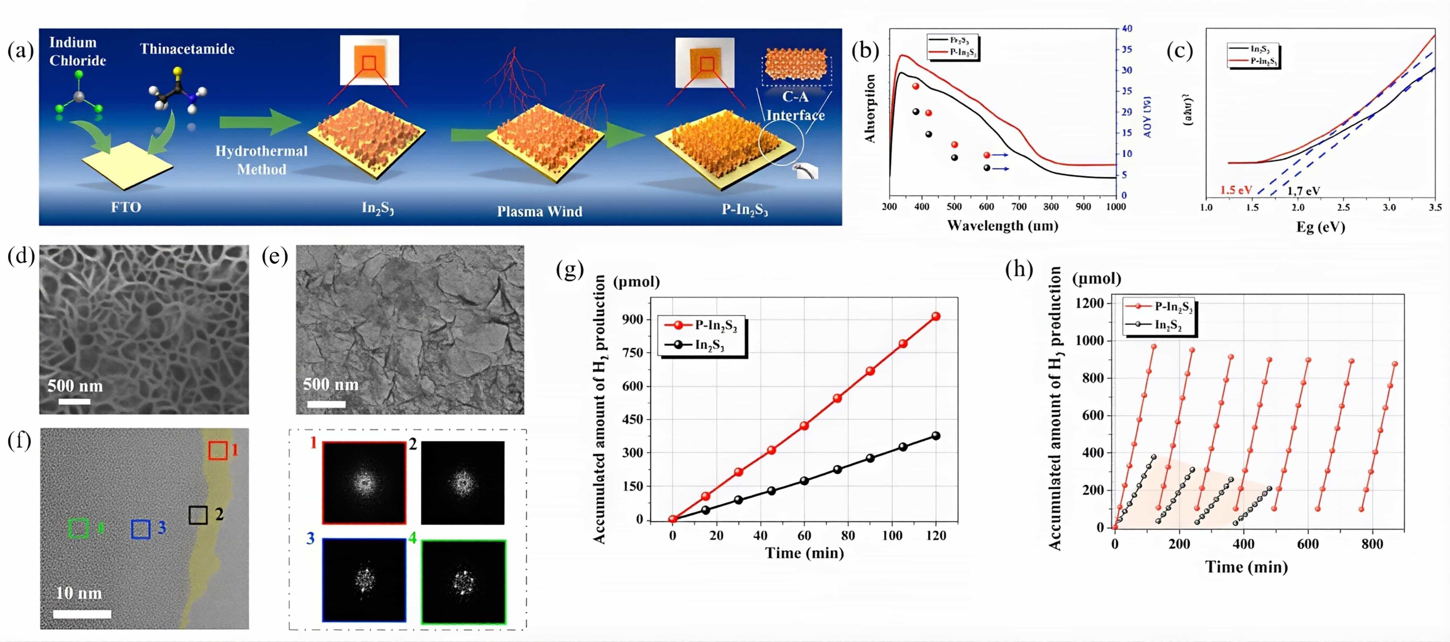 Fig.6 (a)The schematic of the fabrication process of the sample P-In2S3,(b)the light absorption spectra and AQY, (c) the bandgap calculation based on the light absorption spectra,(d)the SEM image, (e) the TEM image, (f) the High-resolution SEM(HRTEM) image of the P-In2S3 sample. The Fourier transforms of the image involving the four box areas are displayed,(g) accumulated amount of hydrogen production of different samples, (h) seven photocatalytic hydrogen production cycles of the P-In2S3 vs. four cycles of the bare In2S3[37]