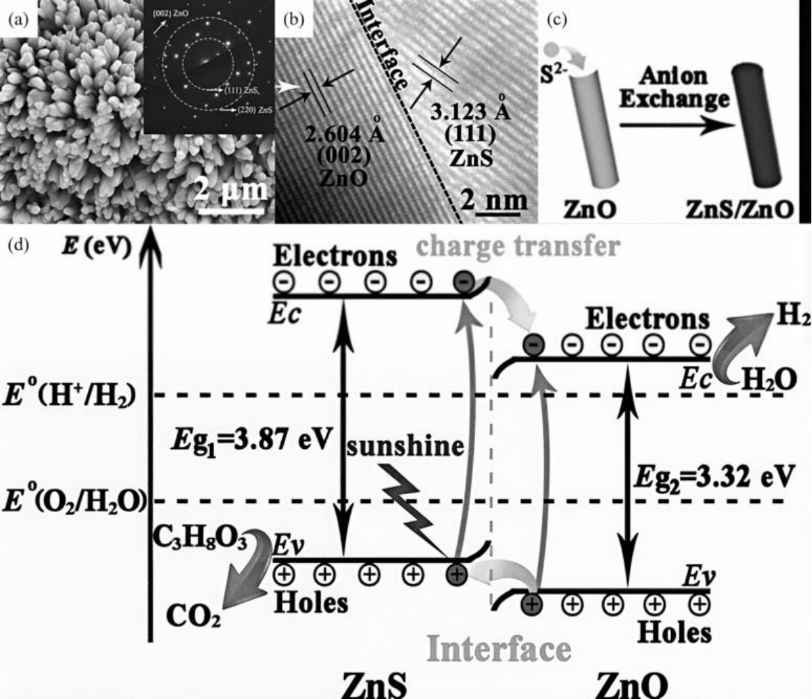 图7 ZnO/ZnS异质结构纳米棒阵列的(a)高分辨率SEM图像、(b)HRTEM图像;(c)ZnO核(黑色)上ZnS(灰色)壳的阴离子交换生长反应方案;(d)电荷转移过程[39]