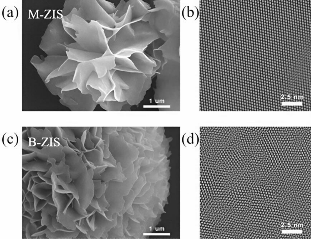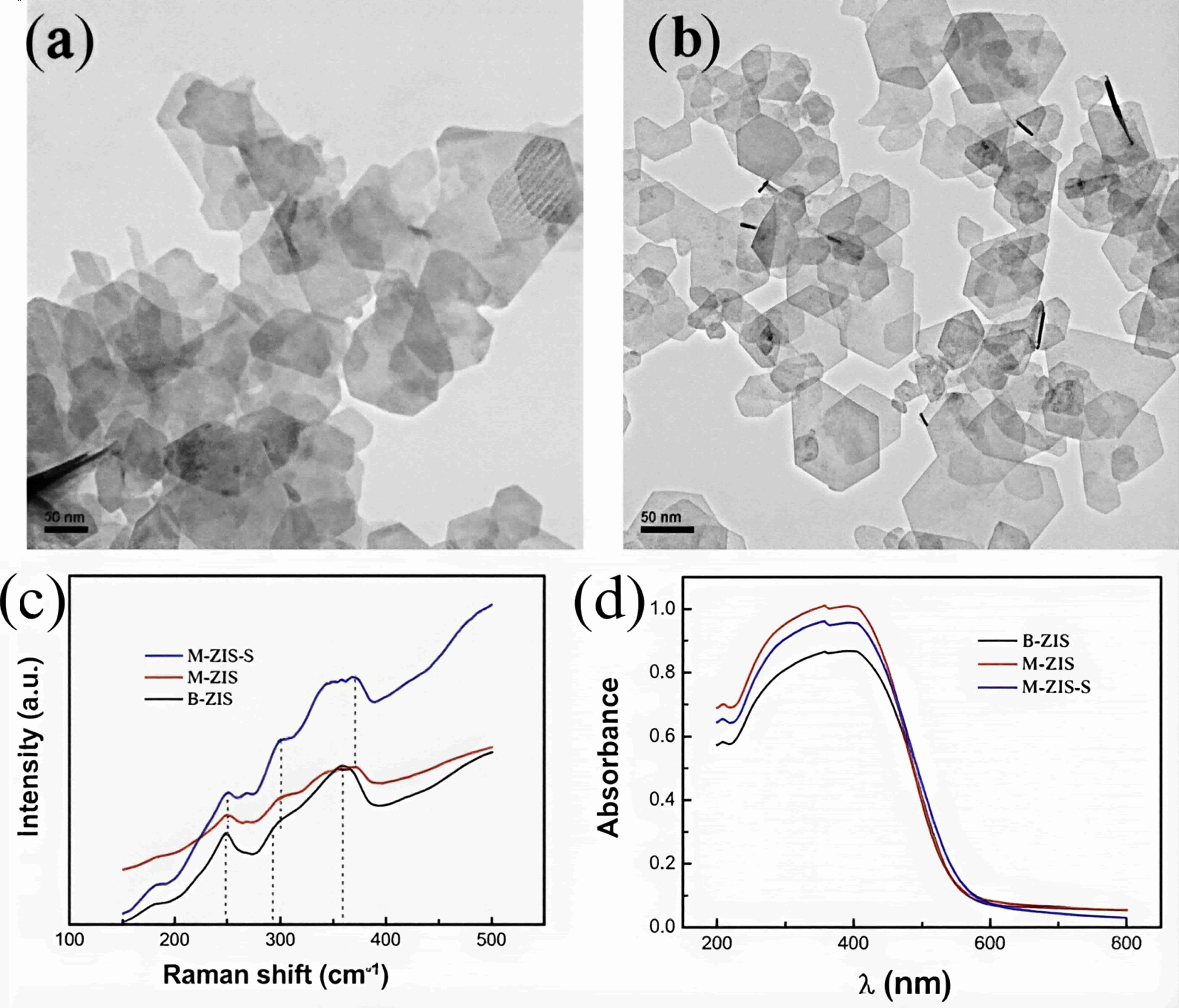 Fig.10 The TEM images of (a)B-ZIS and (b)M-ZIS; (c) The Raman spectra and (d)UV–vis DRS of B-ZIS, M-ZIS and M-ZIS-S[46]