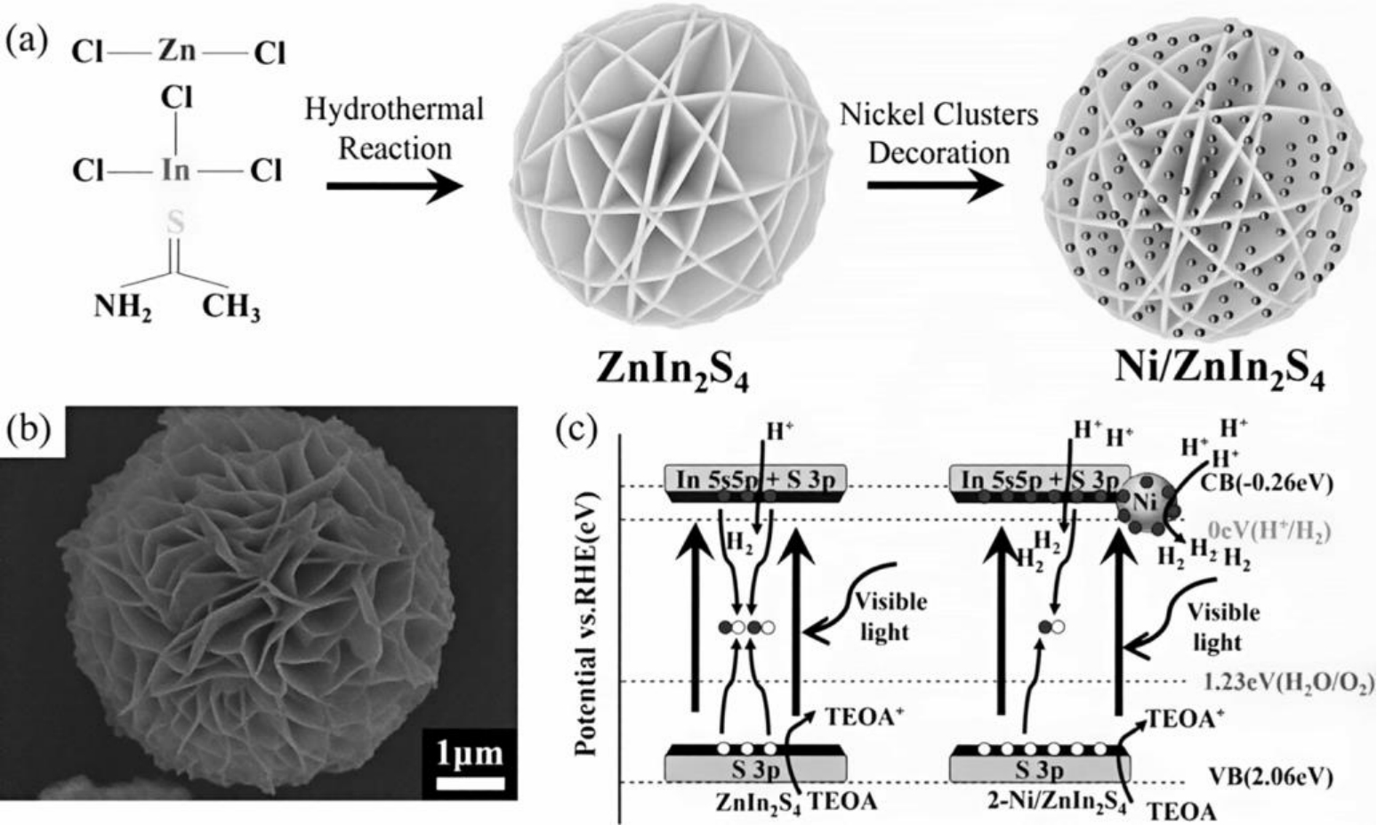 图11 (a)Ni/ZnIn2S4的合成过程示意图;(b)2 wt% Ni/ZnIn2S4的SEM图像;(c)ZnIn2S4和2 wt% Ni/ZnIn2S4的析氢反应机理示意图[47]