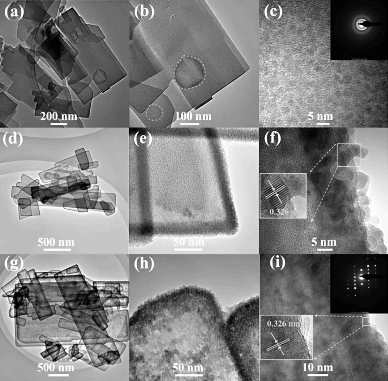 图12 TEM图像:(a–c)ZnS(en)0.5、(d–f)Cd0.5Zn0.5S(en)x和(g–i)Cd0.5Zn0.5S纳米片[51]