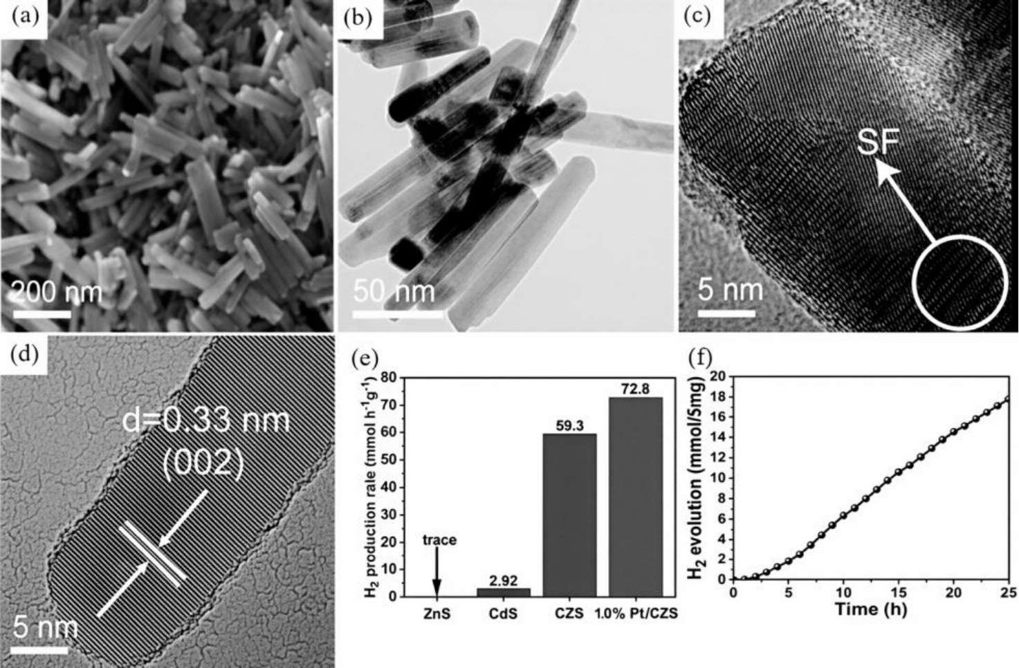 图13 CZS纳米棒的(a)SEM、(b)TEM和(c,d)HRTEM图像;(e)CdS、ZnS、CZS和1.0 wt% Pt/CZS的光催化析氢速率;(f)CZS在可见光照射下25 h的光催化稳定性[52]