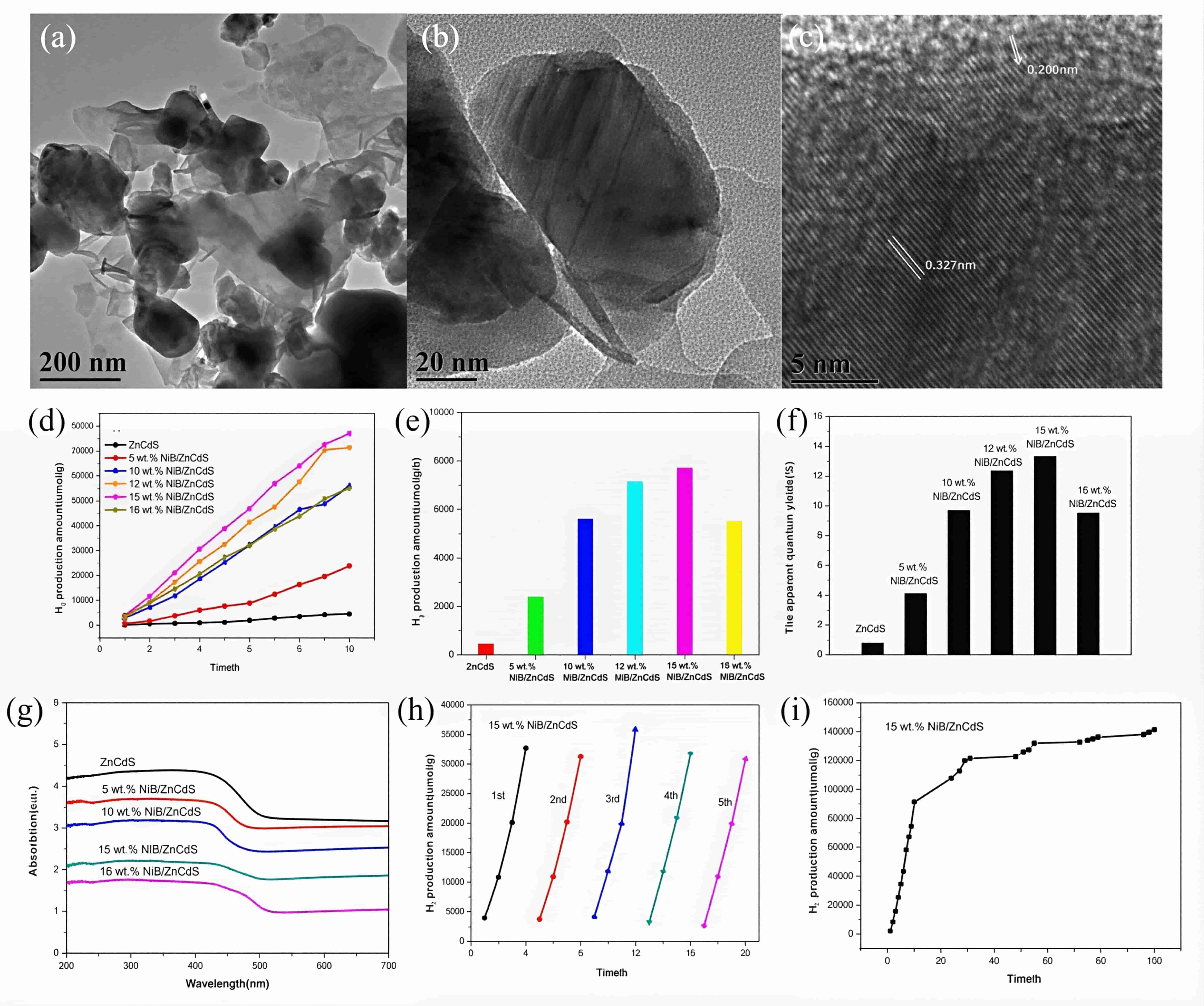Fig.14 (a-c)TEM image of 15 wt% NiB/ZnCdS(d) The H2 production amount of x wt% NiB/ZnCdS samples; (e)the H2 production rate of ZnCdS and NiB/ZnCdS;(f) the apparent quantum yields of ZnCdS samples with different contents of NiB;(g)UV-vis absorption spectra of NiB/ZnCdS samples and pure ZnCdS;(h)the H2 production amount of 15 wt% NiB/ZnCdS after 5 cycles;(i)the stability of 15 wt% NiB/ZnCdS[53]