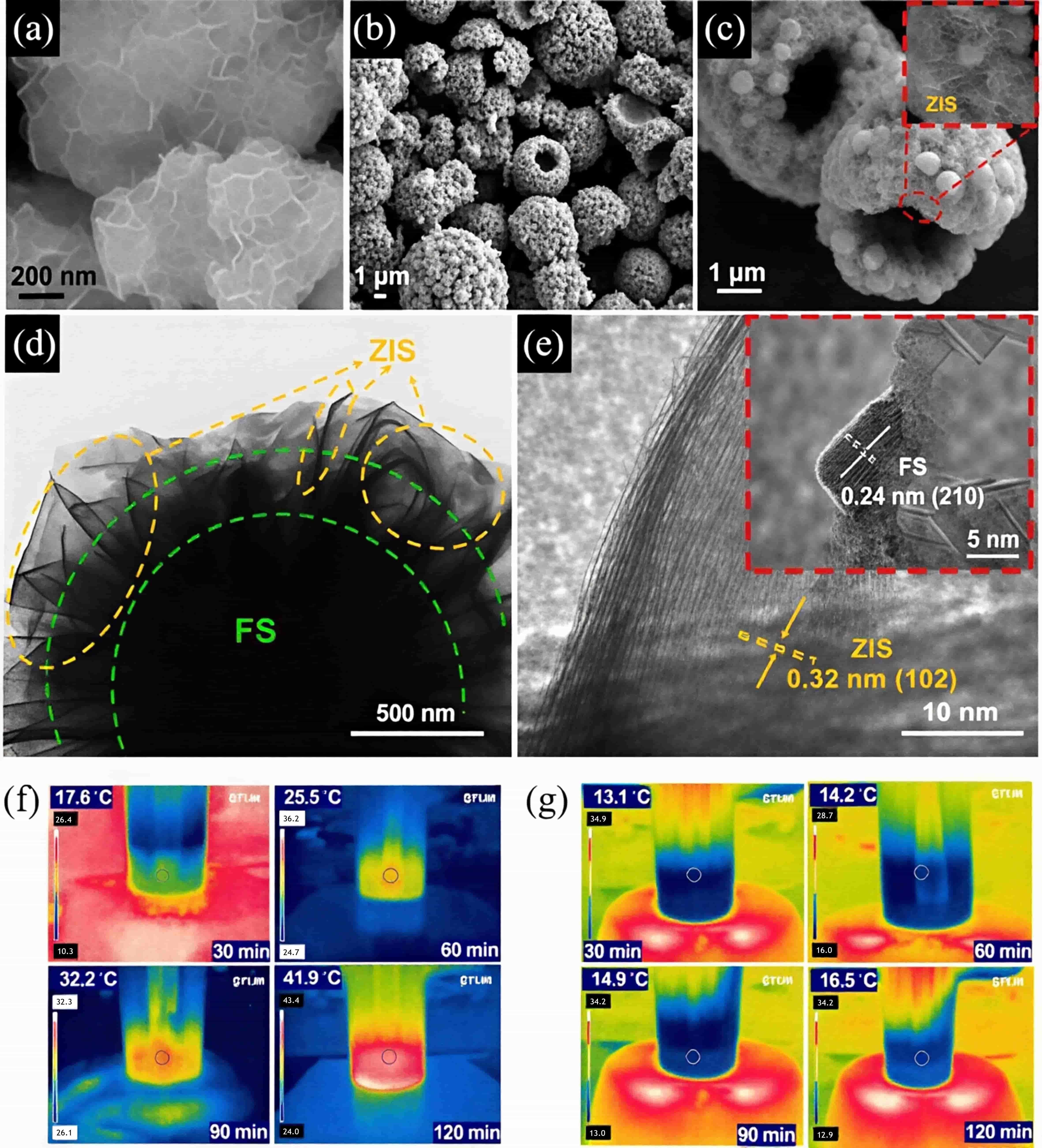 图15 (a)ZIS、(b)FS和(c)FS@ZIS-30的SEM图像;(d)FS@ZIS-30的TEM和(e)HRTEM图像;在AM 1.5G照射下,光热辅助光催化析氢实际反应过程中(f)FS@ZIS-30和(g)ZIS样品的温度分布图[56]