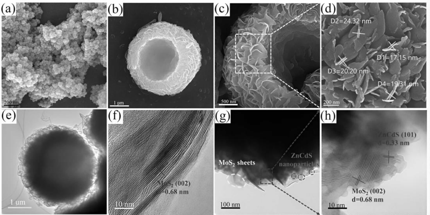 图16 (a)ZnCdS和(b-d)MoS2的的SEM图像。(e-f)MoS2的TEM和HRTEM图像,(g-h)10% M/ZCS的TEM和HRTEM图像[57]