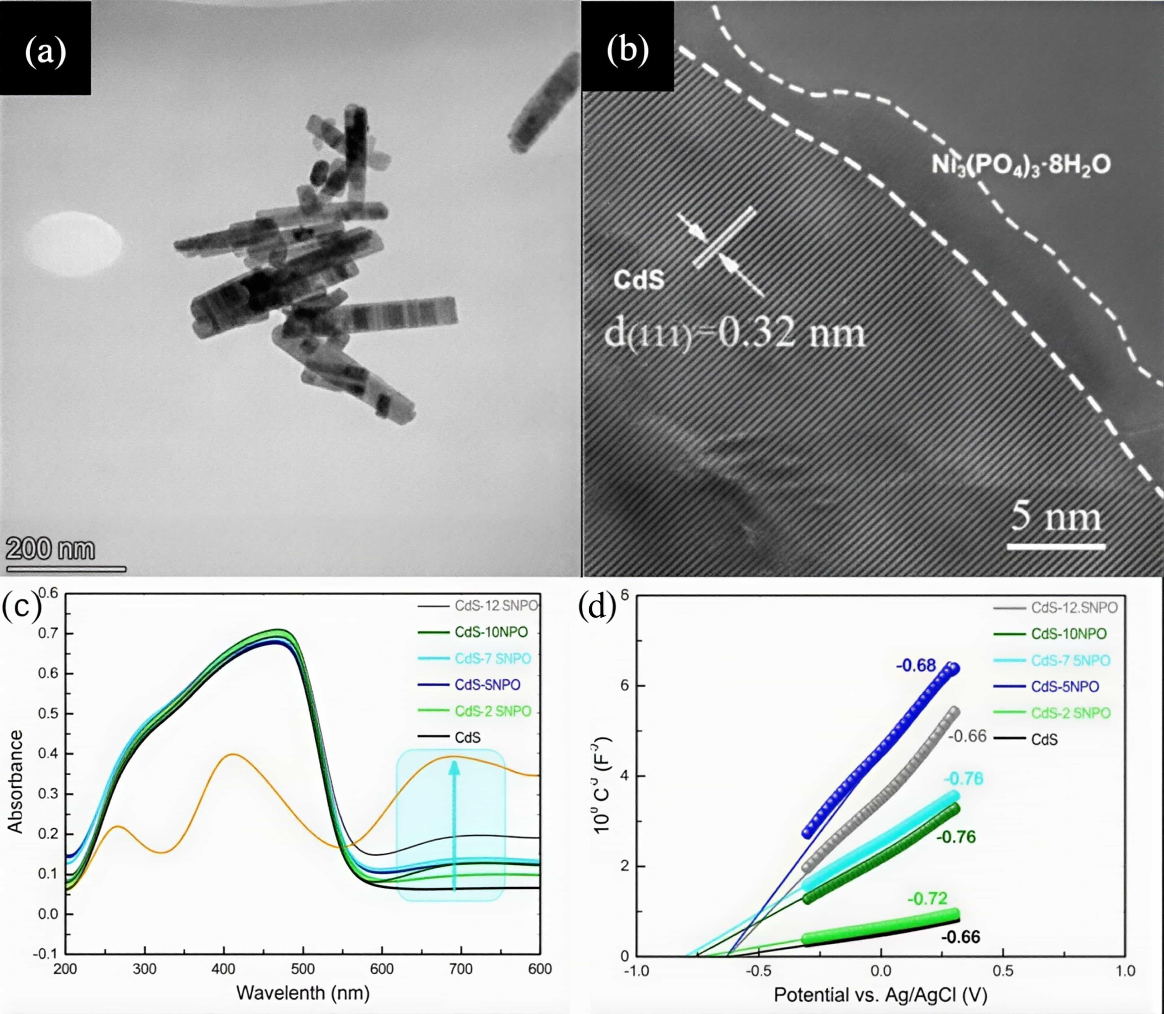 图20 CdS-7.5NPO的(a)TEM图像和(b)HRTEM图像;CdS-xNiPOi系列样品的(c)紫外-可见吸收光谱和(d)M-S曲线[65]注:CdS-xNPO series of samples[65]