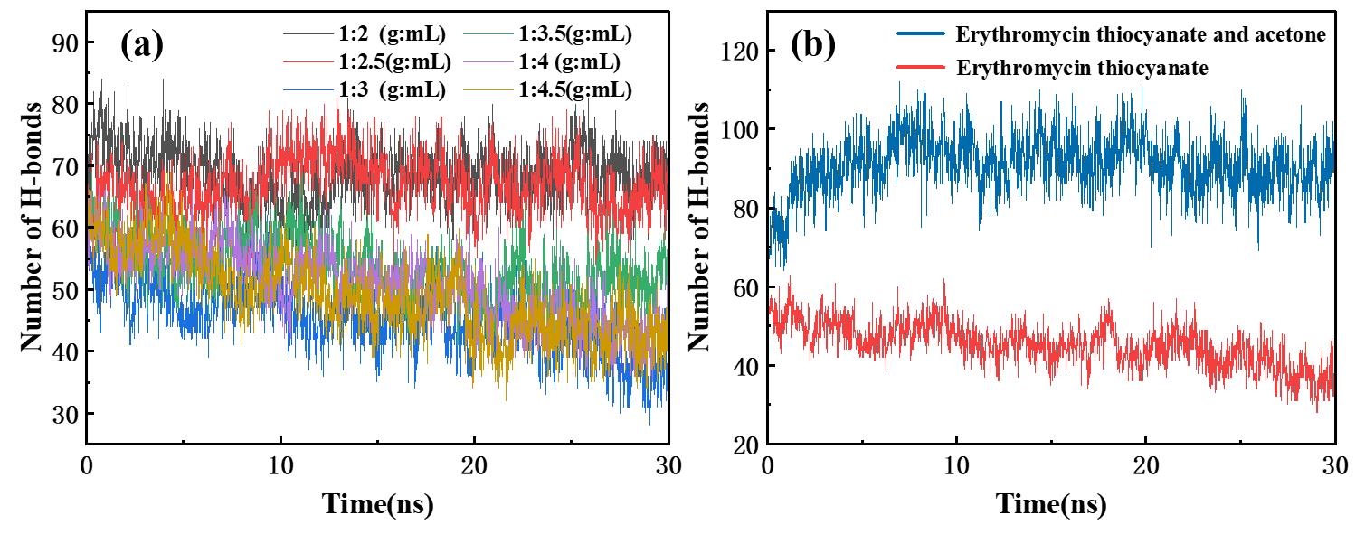 Fig.4 (a)The number of hydrogen bonds between erythromycin thiocyanate molecules changed with time under different solid-liquid ratios. (b)The number of hydrogen bonds between erythromycin thiocyanate and acetone molecules changed with time under 1:3 (g:mL) solid-liquid ratio
