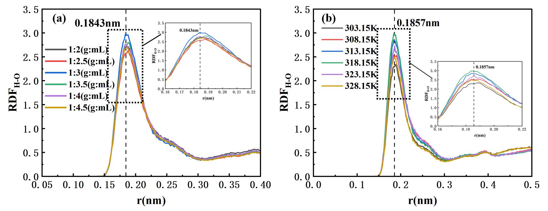 Fig.6 Radial distribution functions (RDFs) of H-O pairs between acetone and erythromycin thiocyanate at 30 ns: (a) effect of solid-liquid ratio; (b) effect of temperature