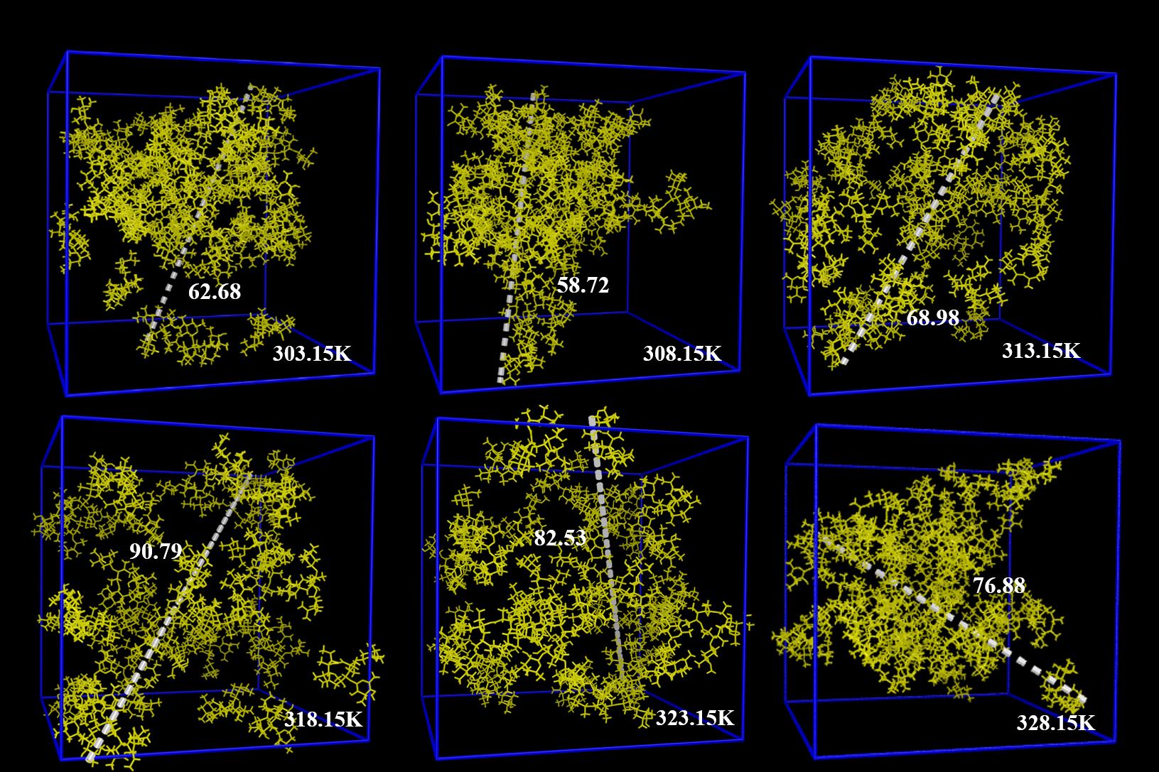 图8 不同温度团簇在30 ns时的快照注:簇中距离最长的两个原子之间的长度值(单位:Å )已被标出