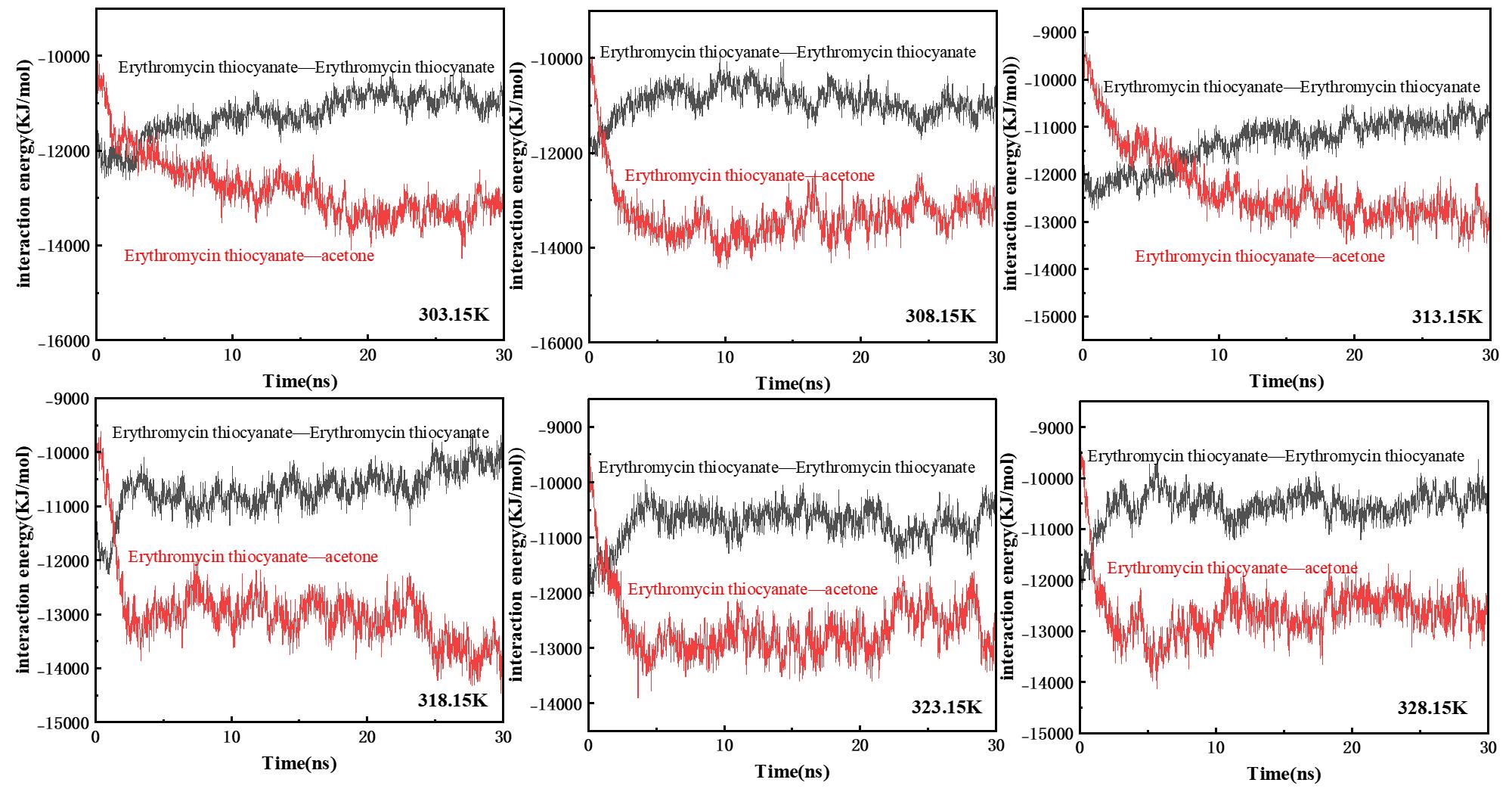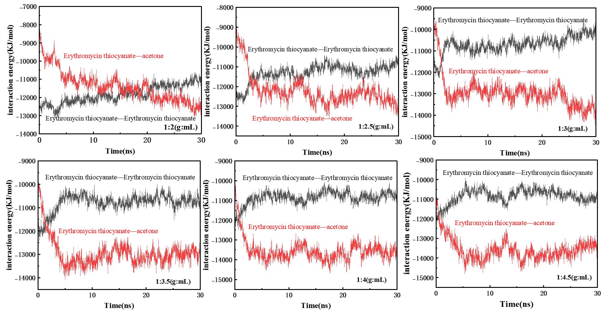 Fig.9 The change of non-bond interaction energy of erythromycin thiocyanate-erythromycin thiocyanate(E-E) and erythromycin thiocyanate-acetone(E-A) with time under different solid-liquid ratio conditions