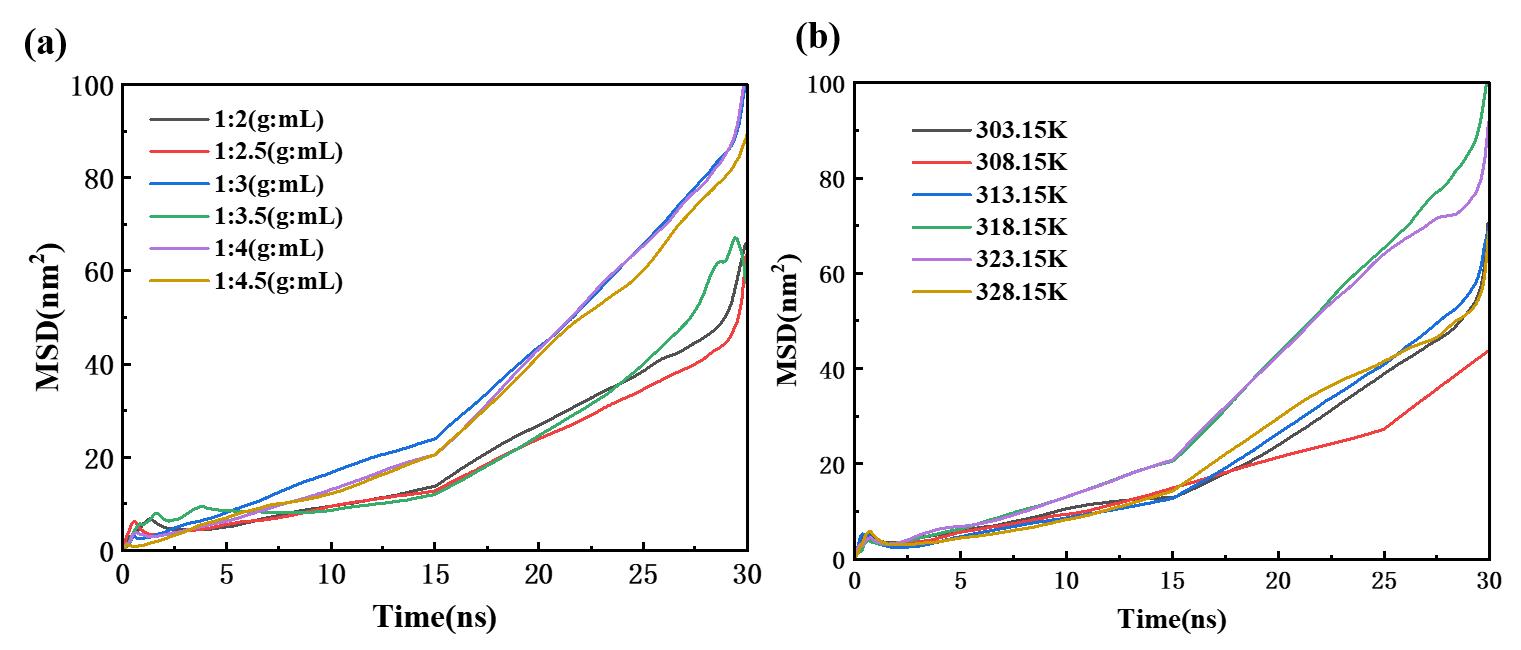 Fig. 11 Mean square displacement (MSD) of erythromycin thiocyanate clusters as a function of time: (a) under different solid-liquid ratios; (b) at different temperatures