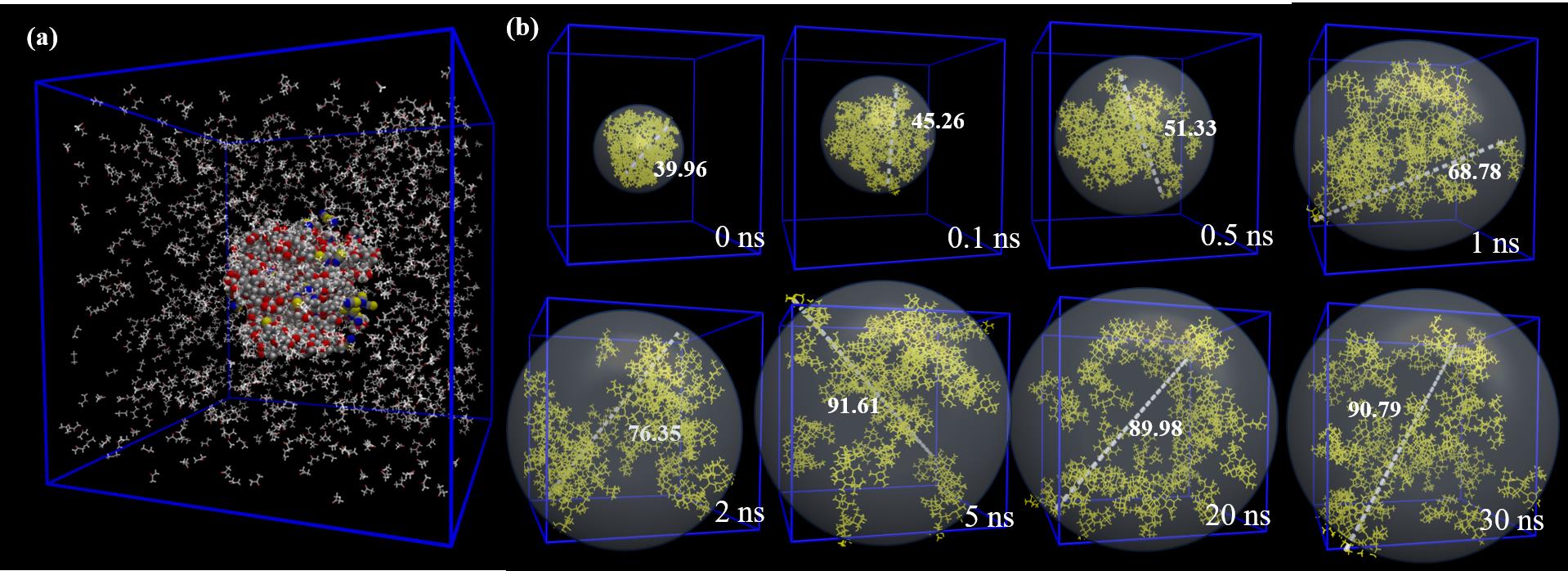 图12 (a)系统模型;(b)在固液比为1:3 (g:mL)丙酮溶液中分散过程中不同时间点的团簇快照