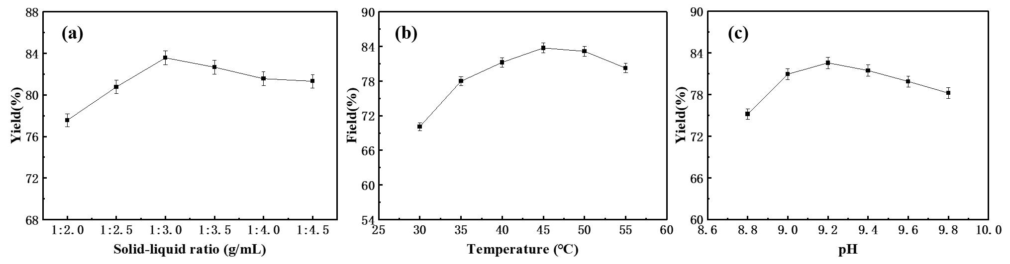 图13 萃取实验条件对硫氰酸红霉素收率的影响:(a)固液比,(b)温度和(c)pH