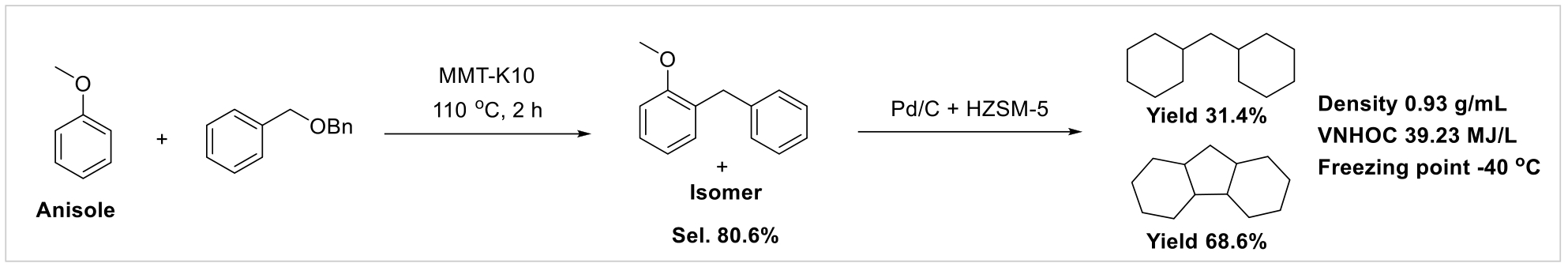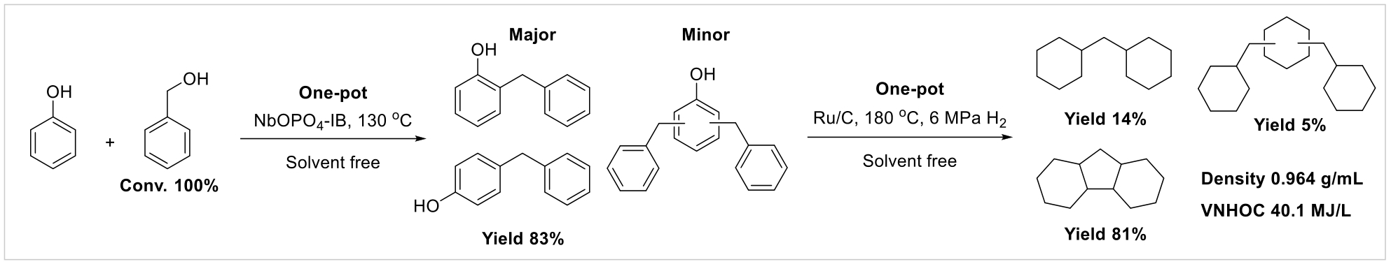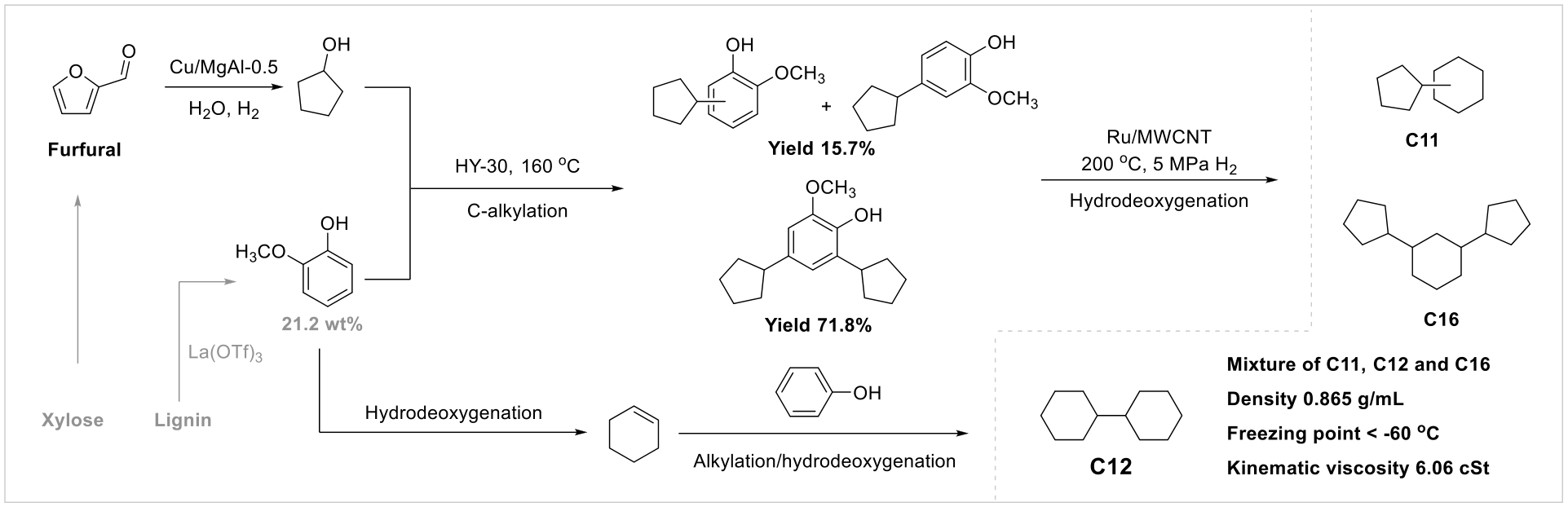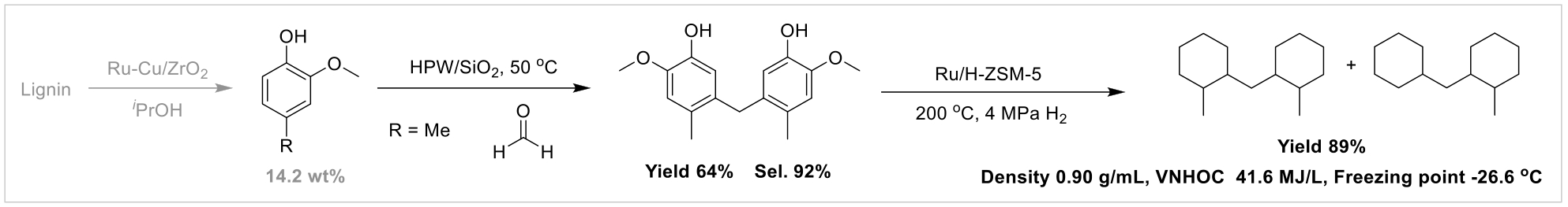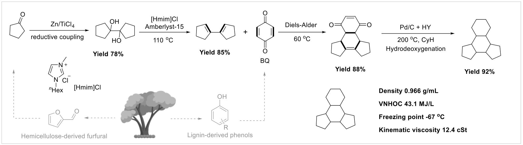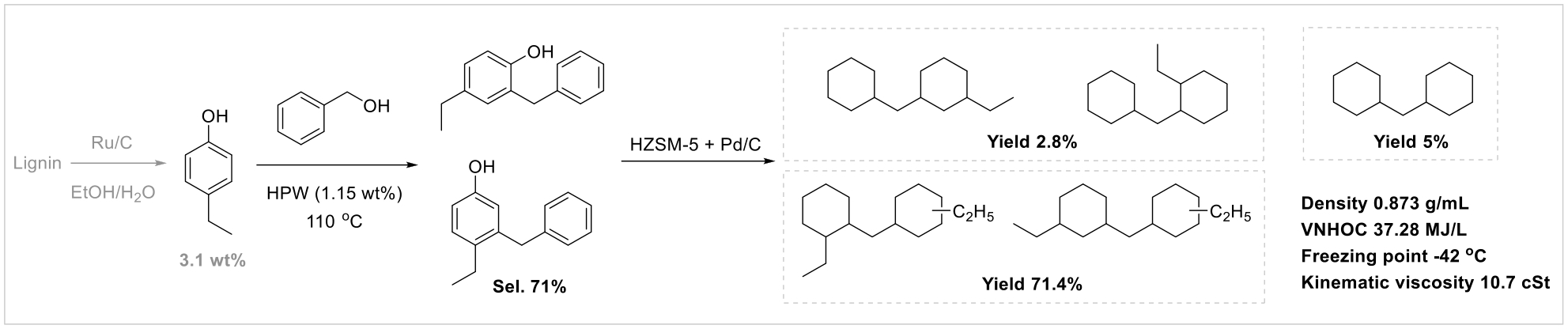 高密度特种燃料因具有高能量密度、低冰点等优异性能,对提升飞行器航程、载荷与机动性具有关键意义,是国防航空领域的战略性能源。目前,此类燃料主要依赖石油资源,在“碳达峰、碳中和”背景下,开发可再生替代路线尤为迫切。木质素作为木质纤维素中富含芳环结构的主要组分之一,尚未得到高效利用,其独特的环状骨架为构建高密度燃料提供了理想前体。本文系统综述了木质素平台化合物(如苯酚类、苯甲醛类、苯醌、环己酮等)转化为高密度特种燃料的研究进展,重点阐述了烷基化、羟醛缩合、Diels‑Alder反应、迈克尔加成等构建多环燃料前驱体的方法,并分析了当前合成过程中面临的挑战。未来研究需关注燃料分子结构与性能之间的构效关系,以突破高密度、高热值、低冰点难以兼具的瓶颈,还应开展全生命周期碳排放分析和技术经济性评估,为技术可持续性与产业化决策提供支撑。本综述旨在为木质素基高密度特种燃料的研究提供参考,并为其可持续开发提供思路。