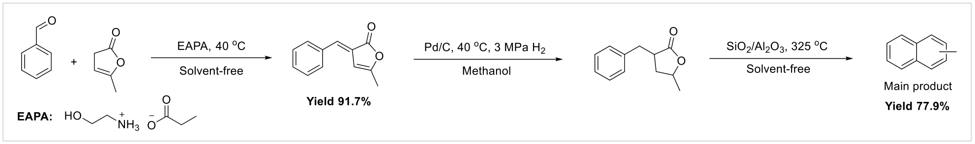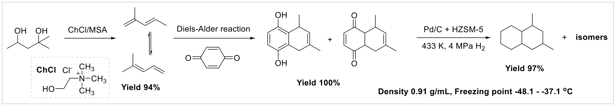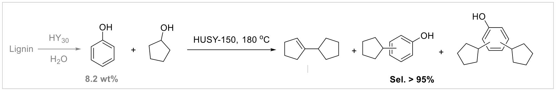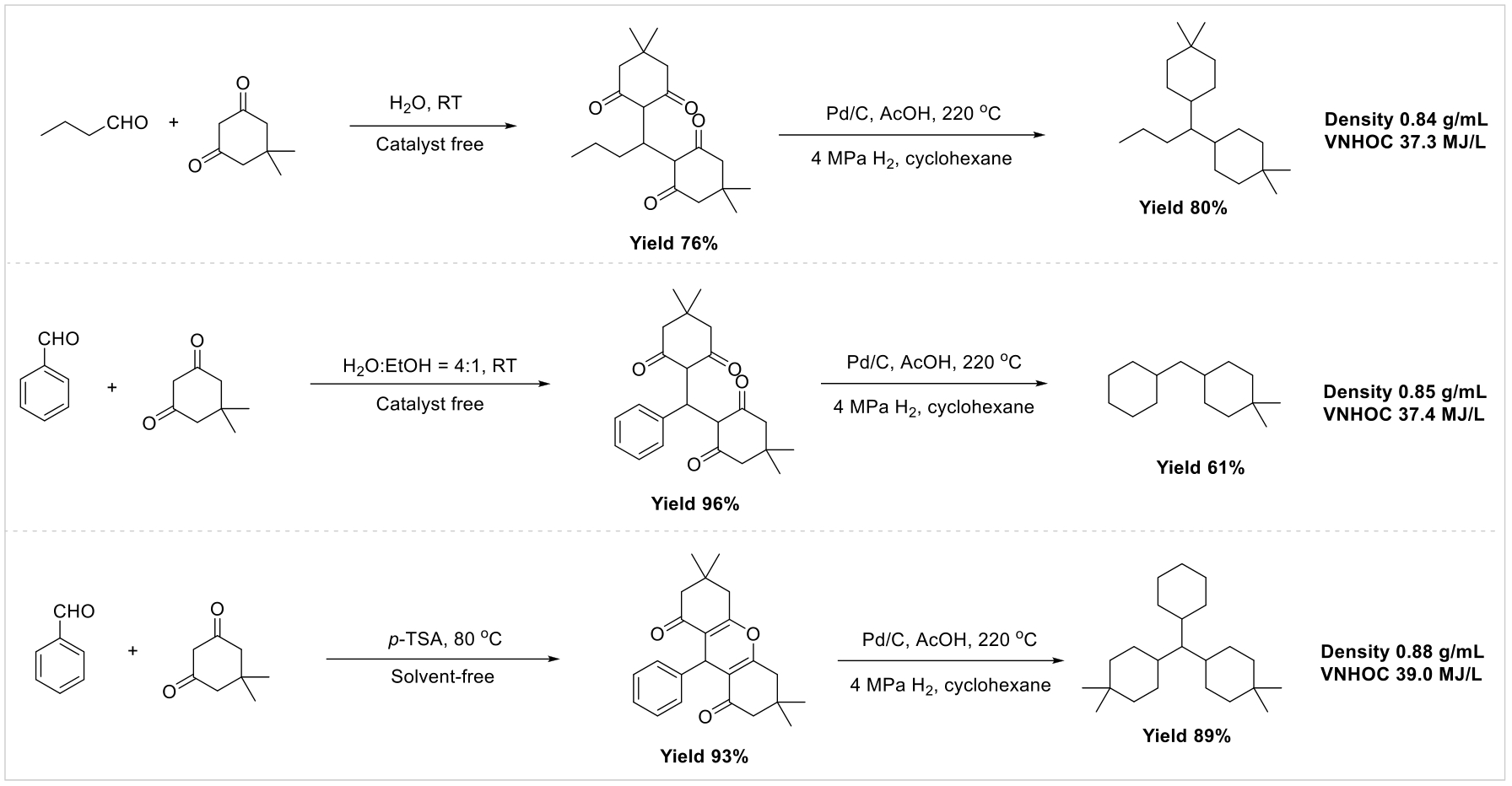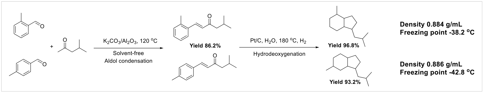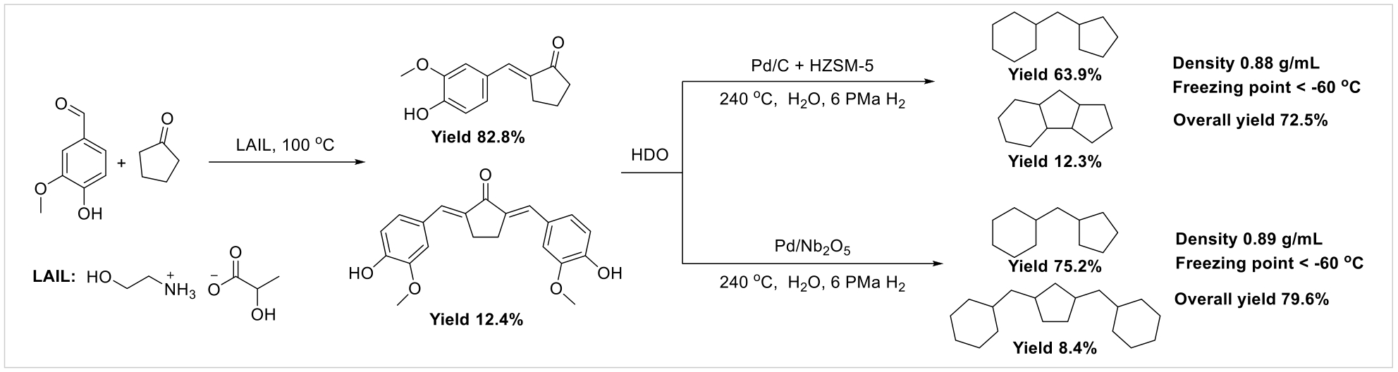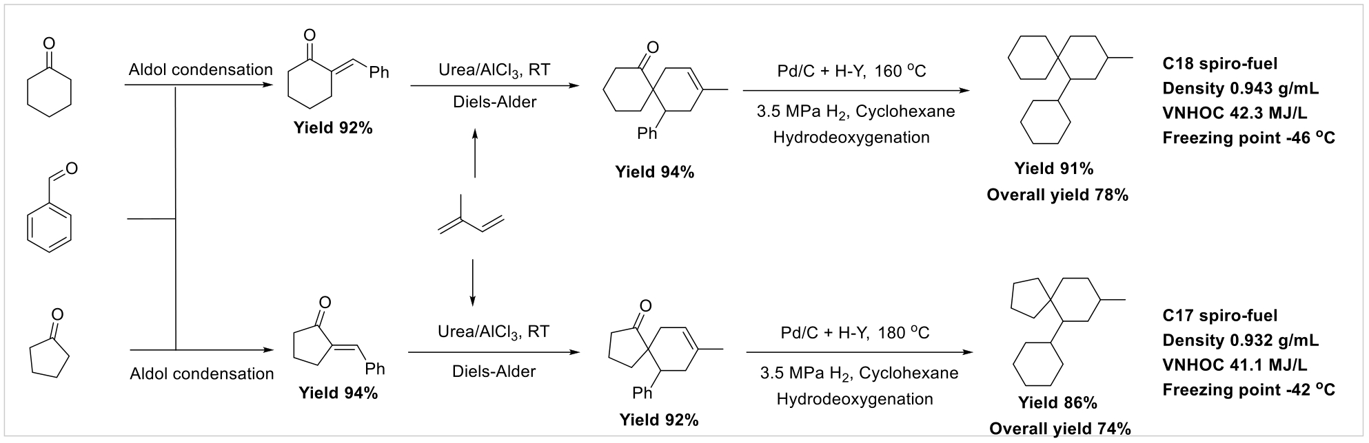 高密度特种燃料因具有高能量密度、低冰点等优异性能,对提升飞行器航程、载荷与机动性具有关键意义,是国防航空领域的战略性能源。目前,此类燃料主要依赖石油资源,在“碳达峰、碳中和”背景下,开发可再生替代路线尤为迫切。木质素作为木质纤维素中富含芳环结构的主要组分之一,尚未得到高效利用,其独特的环状骨架为构建高密度燃料提供了理想前体。本文系统综述了木质素平台化合物(如苯酚类、苯甲醛类、苯醌、环己酮等)转化为高密度特种燃料的研究进展,重点阐述了烷基化、羟醛缩合、Diels‑Alder反应、迈克尔加成等构建多环燃料前驱体的方法,并分析了当前合成过程中面临的挑战。未来研究需关注燃料分子结构与性能之间的构效关系,以突破高密度、高热值、低冰点难以兼具的瓶颈,还应开展全生命周期碳排放分析和技术经济性评估,为技术可持续性与产业化决策提供支撑。本综述旨在为木质素基高密度特种燃料的研究提供参考,并为其可持续开发提供思路。