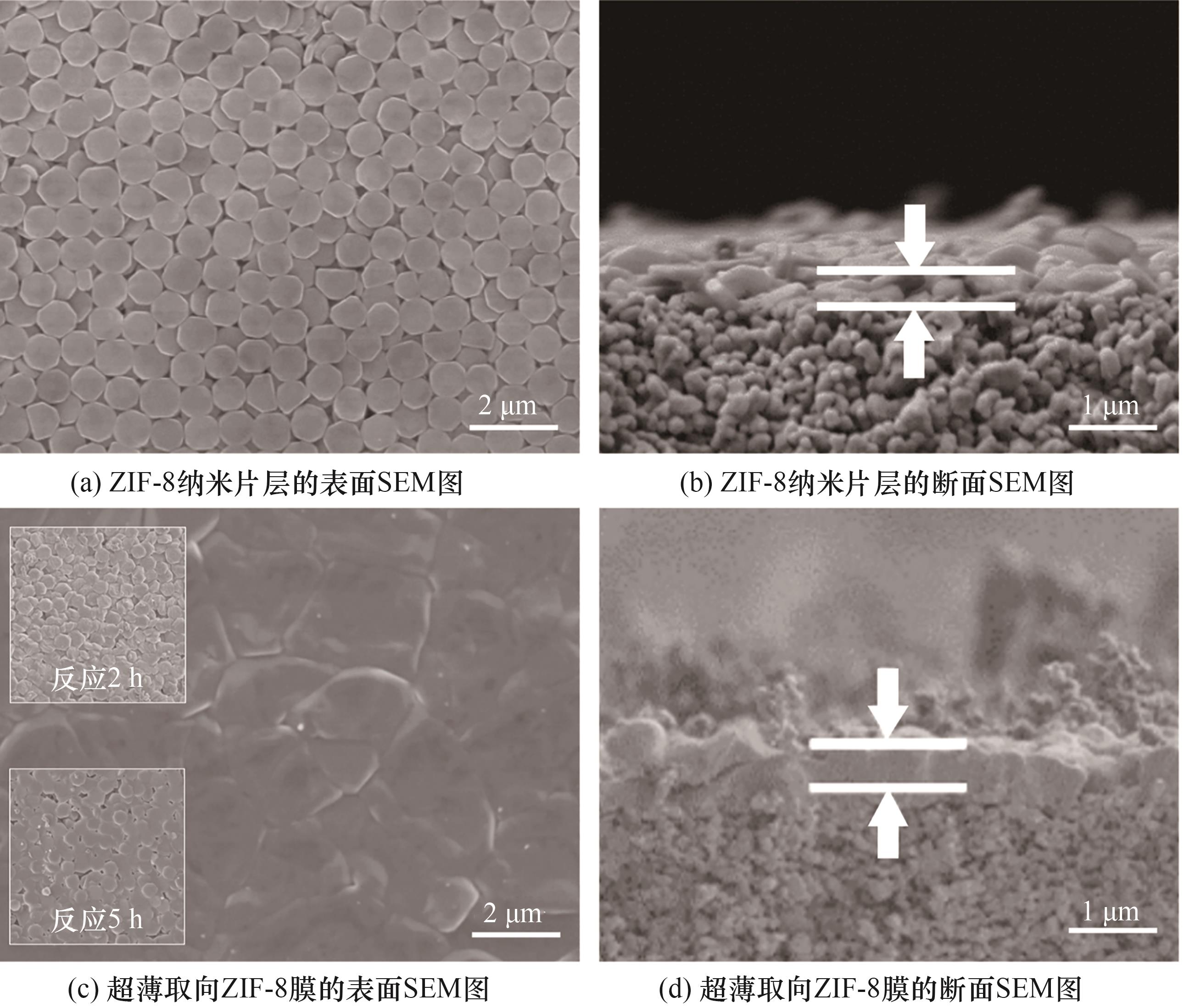图7 取向排布的ZIF-8纳米片层及由其外延生长制备的取向ZIF-8膜的表面和断面SEM图