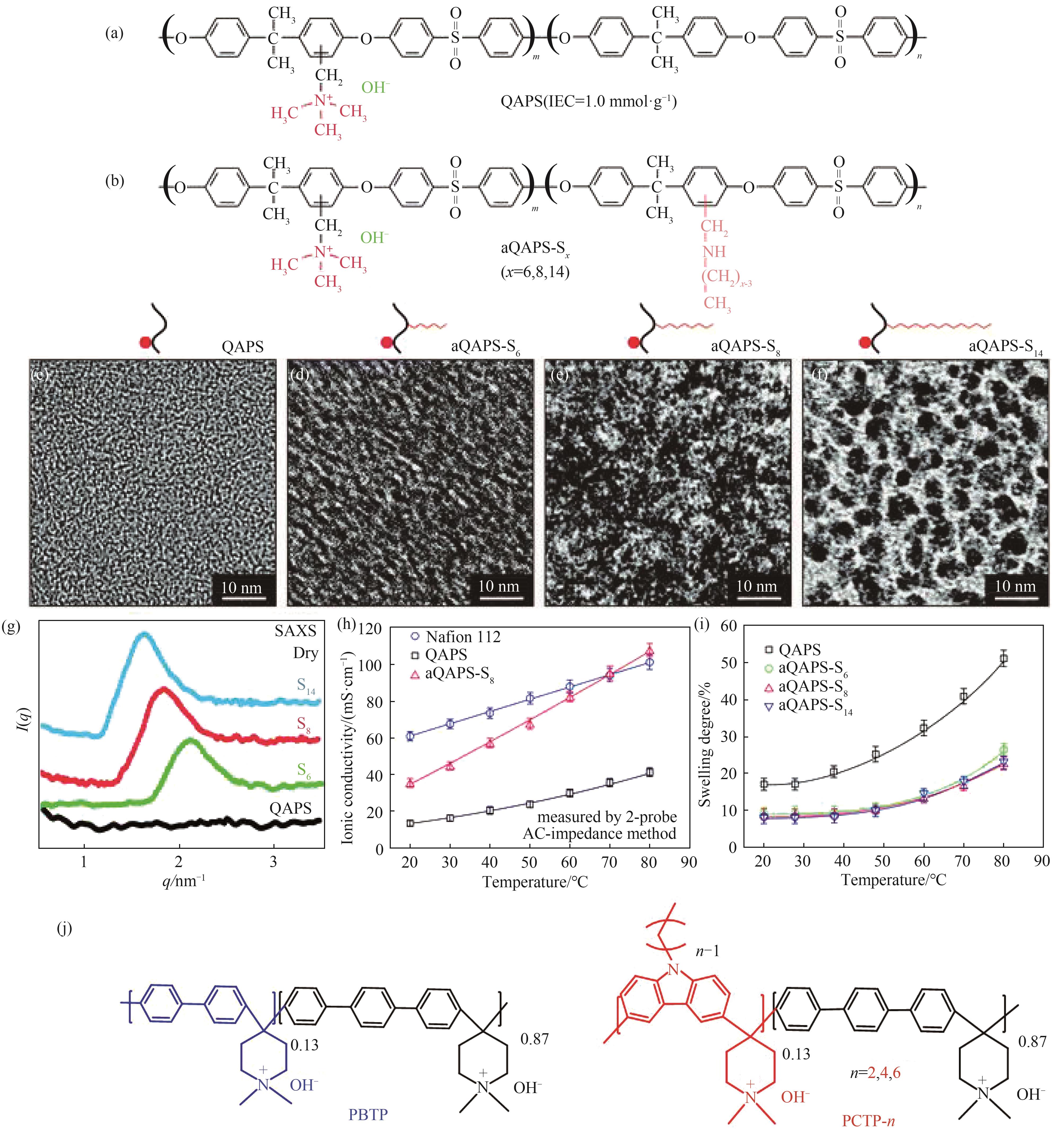 图5 QAPS结构微相分离策略示意图[59-60](a),(b) aQAPS-S x 结构; (c)~(f) TEM图像;(g)SAXS图像;(h) 离子传导率与温度关系;(i) 溶胀率与温度关系;(j) PBTP及PCTP-n结构