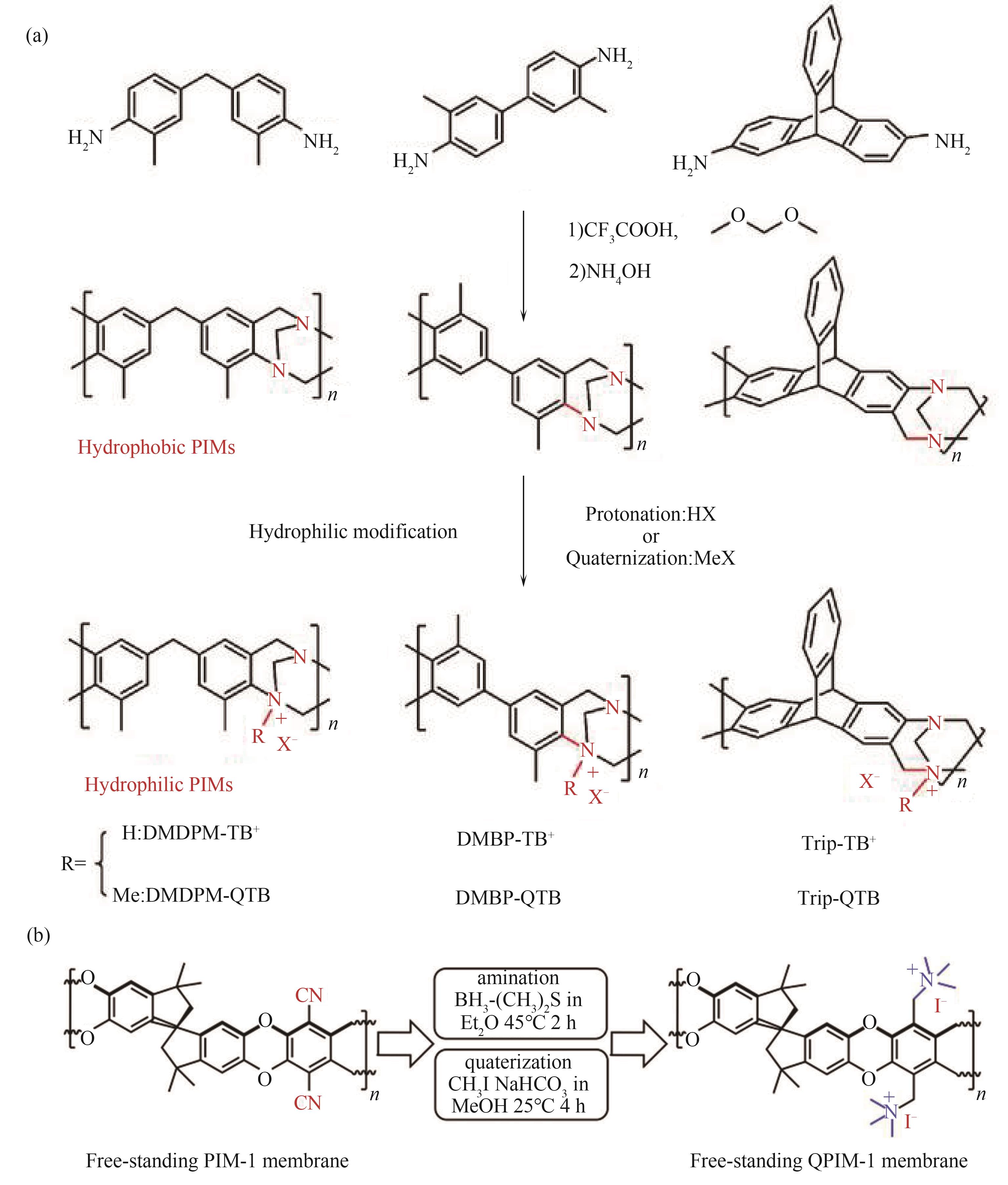 Fig.9 Synthetic route of AEM from positively charged PIMs[68,71](a) Tröger’s base AEM synthesis route; (b) AEM modification route based on PIM-1 structure