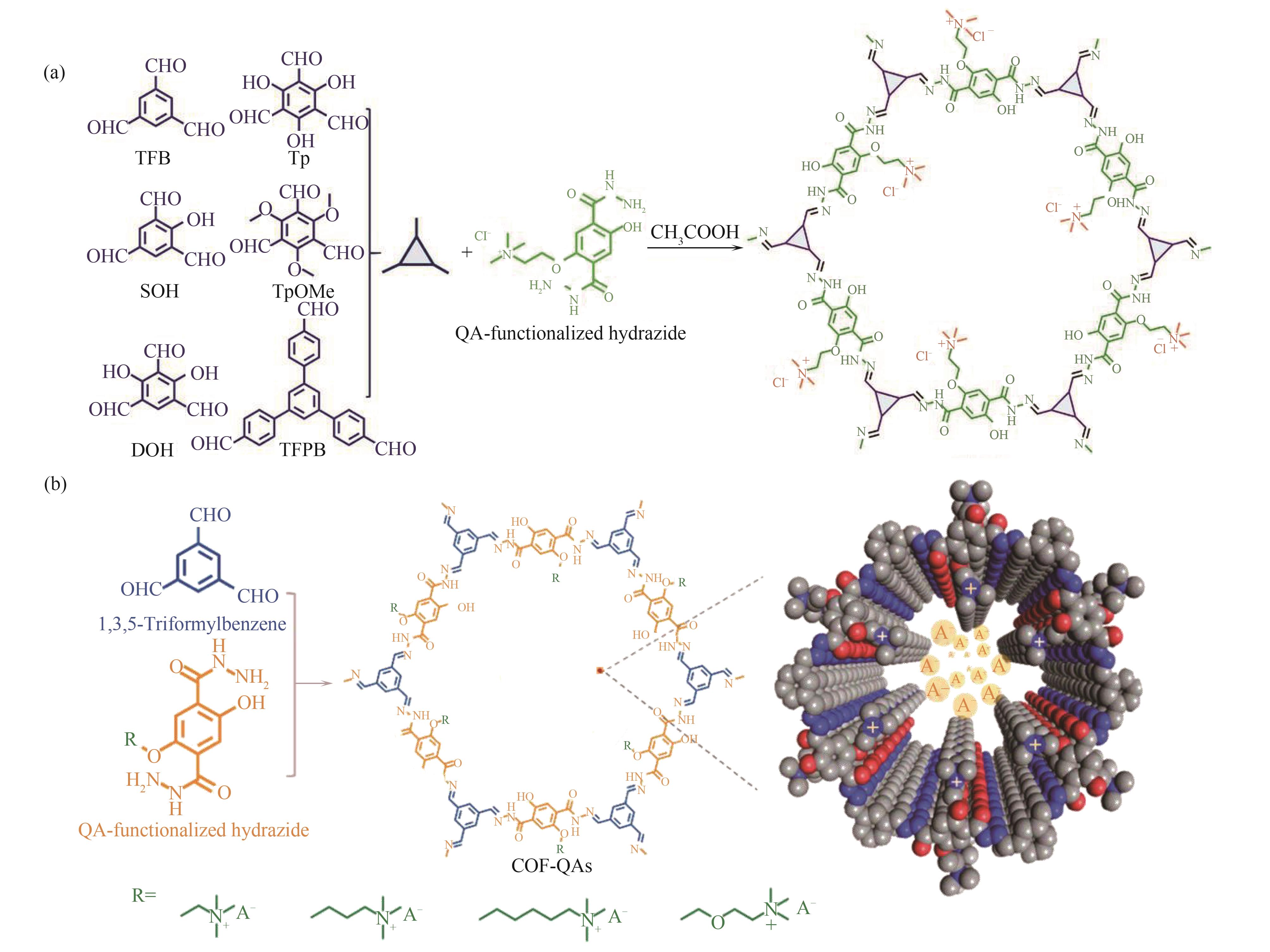 图10 COFs材料合成路径[78-79](a) 醛单体调节COF-QAs结构;(b) 侧链长度调节COF-QAs结构