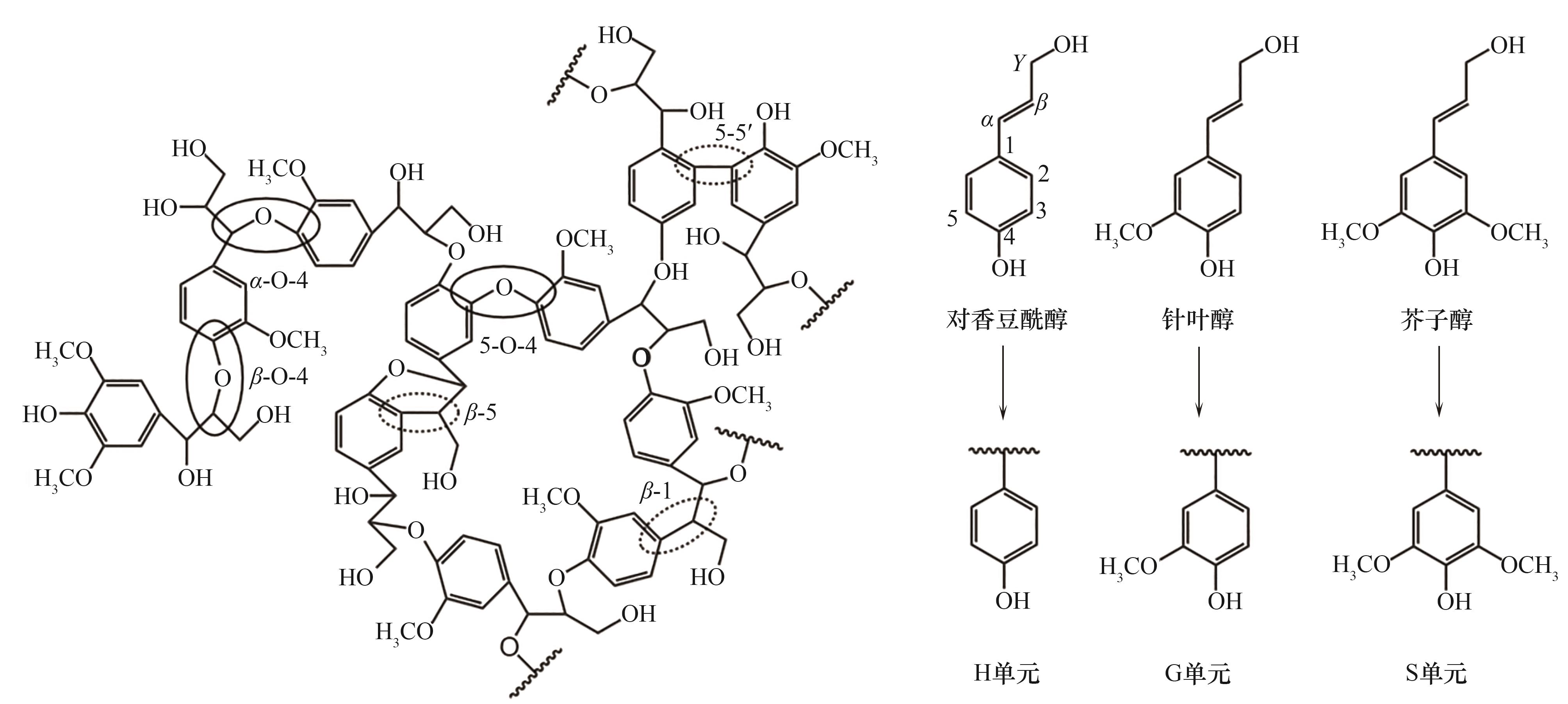 图1 木质素的几种典型键的化学模型结构及三种苯基丙烷前体和基本单元