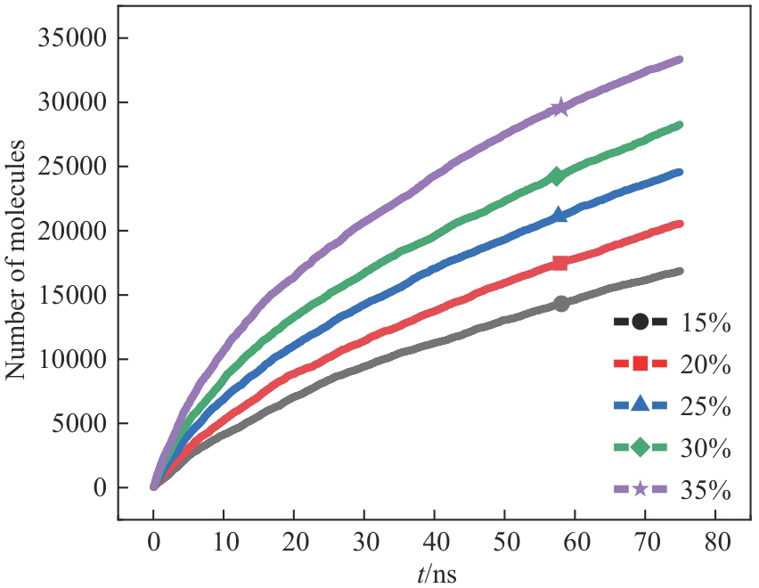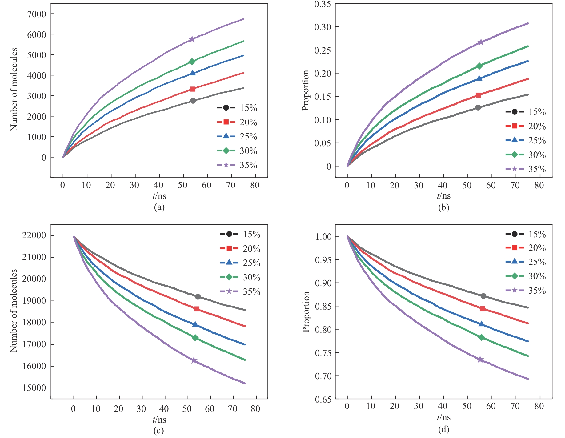 图9 不同硫酸浓度下分子数及比例随时间变化: (a)、(b)消耗磷矿分子; (c)、(d)未参与反应的磷矿分子
