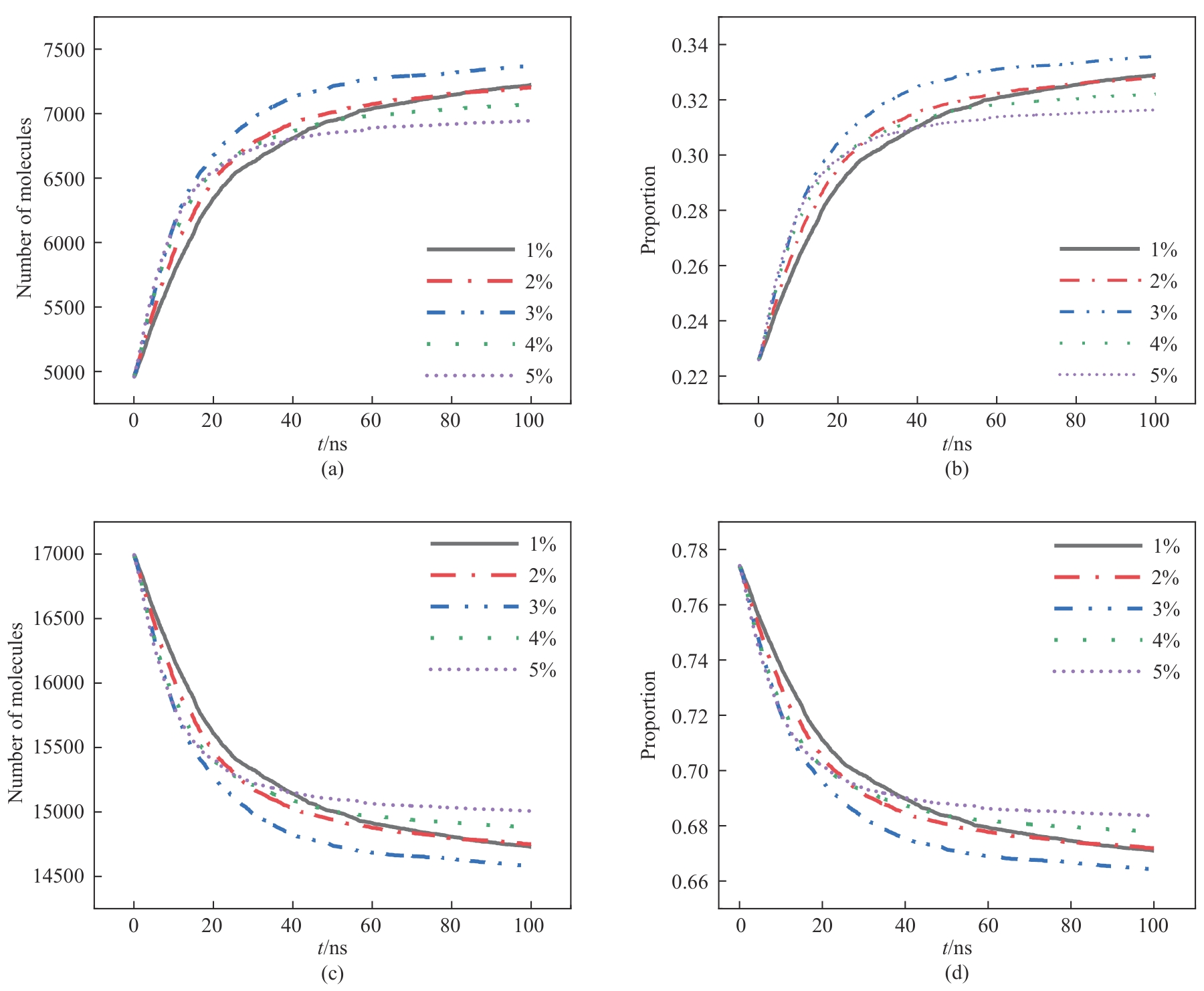 图5 不同磷酸浓度下分子数及比例随时间变化:(a)、(b)消耗磷矿分子;(c)、(d)未参与反应的磷矿分子