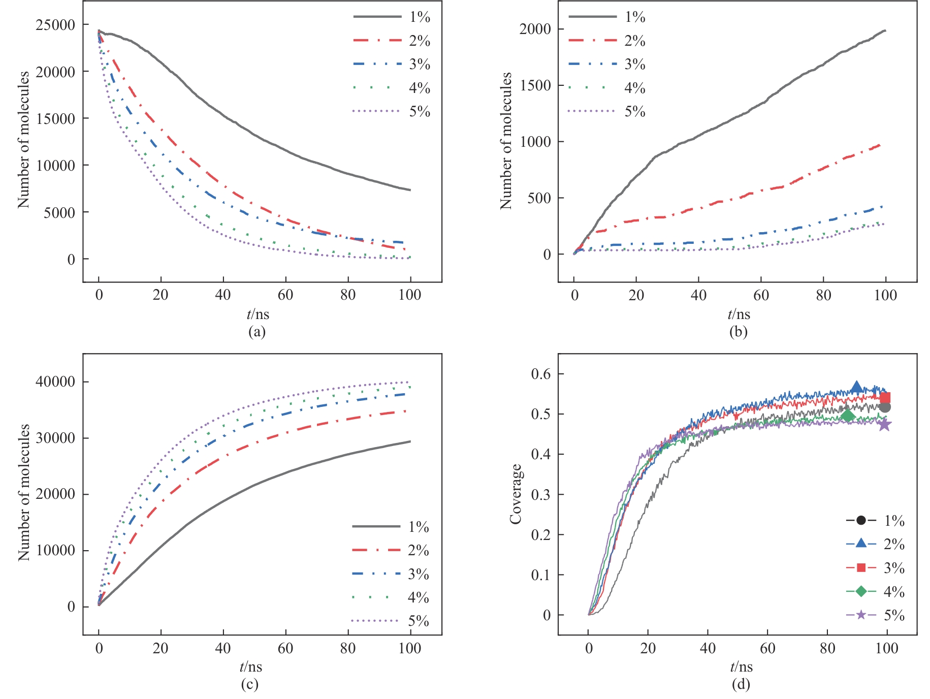 图10 不同硫酸浓度下各物质分子数随时间变化: (a)Ca(H2PO4)2;(b)共晶磷;(c)CaSO4;(d)磷矿表面覆盖率