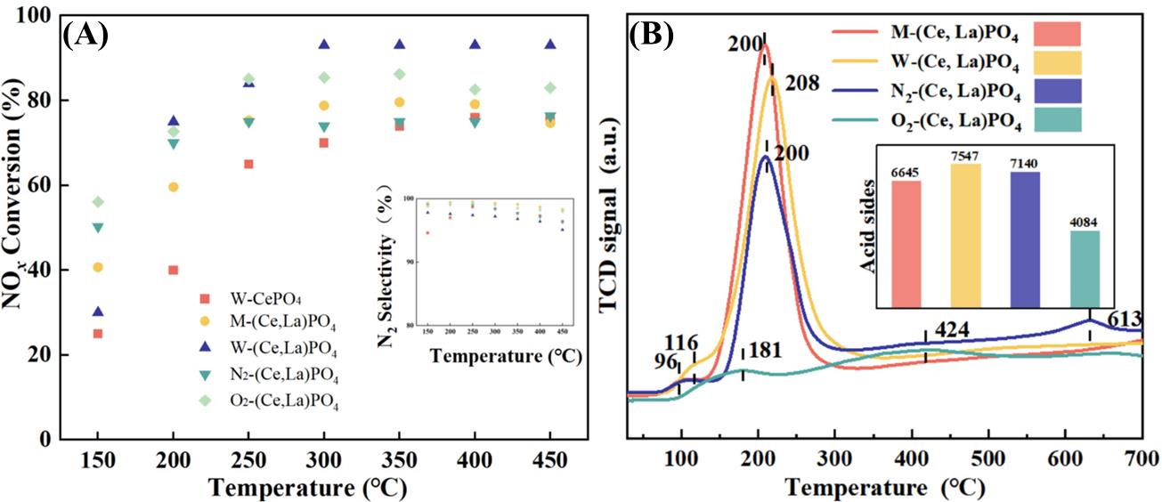 Fig. 6 (A) NH3-SCR activity for different calcination conditions, (B) NH3-TPD results for catalysts with different calcination conditions [45]