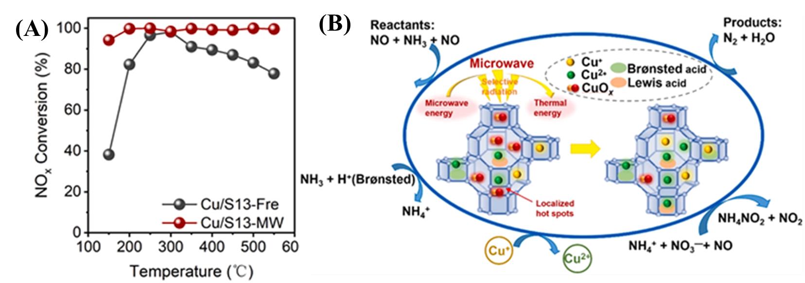 Fig. 8 (A)Catalytic activity and (B) reaction mechanism diagram on Cu/SSZ-13 zeolite before and after microwave activation[50]