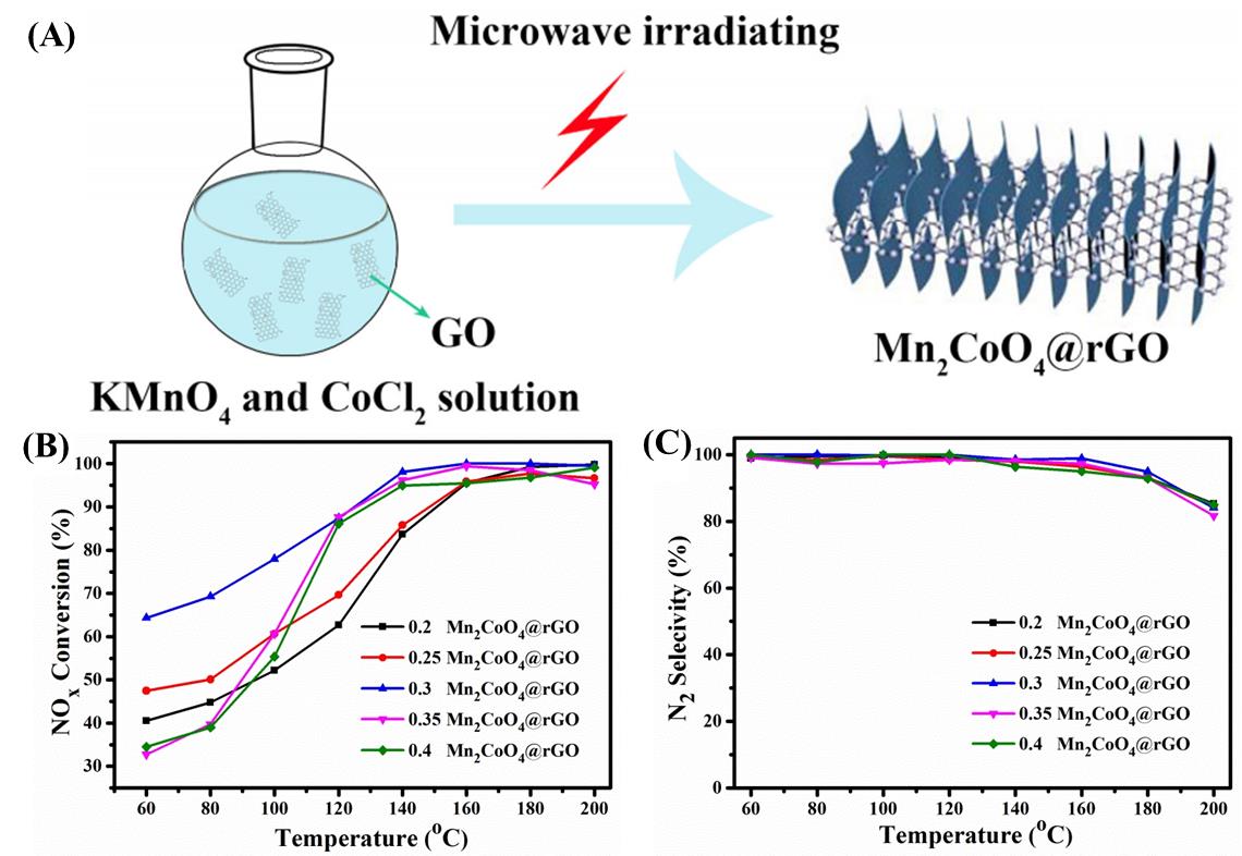 Fig. 10 (A) Schematic of the synthesis of Mn2CoO4@rGO catalyst, (B) NH3-SCR performance, (C) N2 selectivity of the catalyst[40]