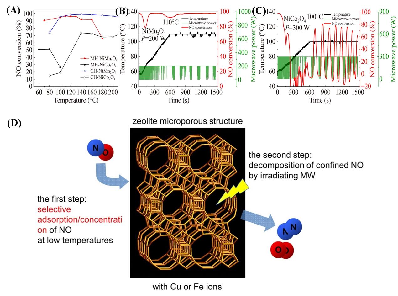 图11 (A)催化剂在微波加热(MH)和常规加热(CH)下的活性;微波加热下(B)NiMn2O4和(C)NiCo2O4催化剂的NH3-SCR活性[71];(D)使用掺杂MeO x (Me=Mn、Ni、Cu)的沸石去除NO的催化还原过程[70]