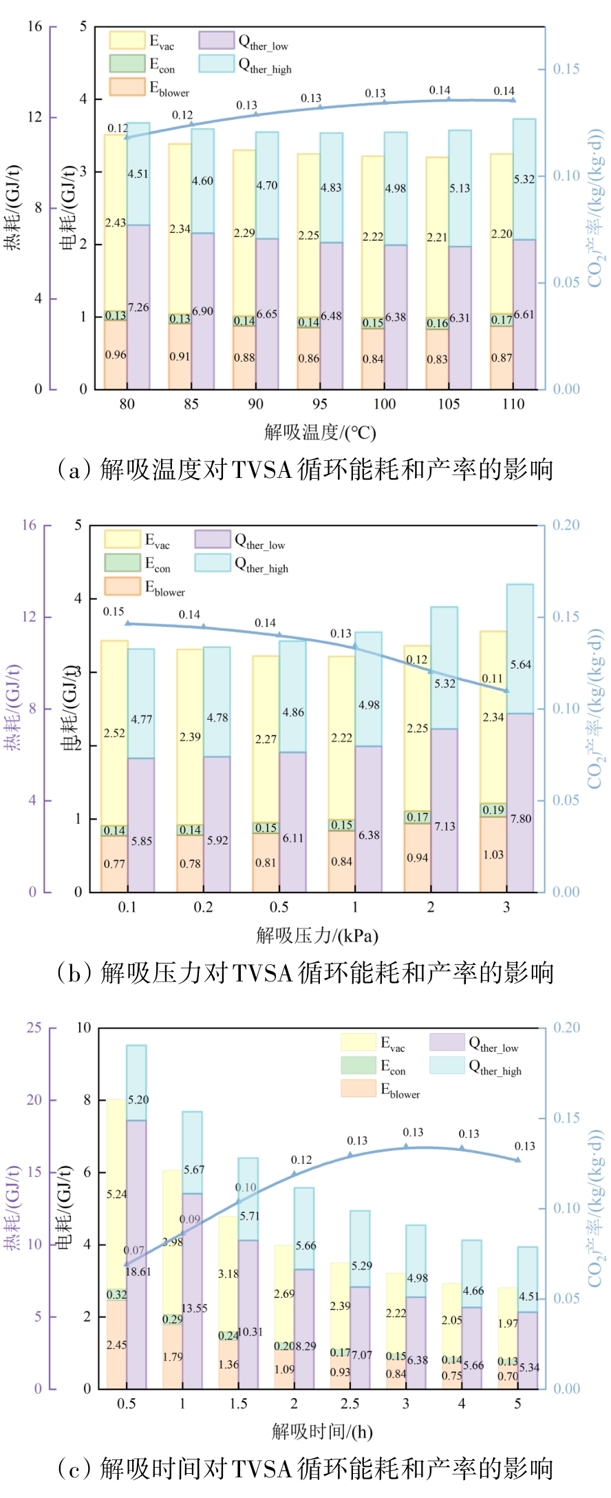 图8 高温解吸阶段运行参数对TVSA循环的能耗和产率的影响