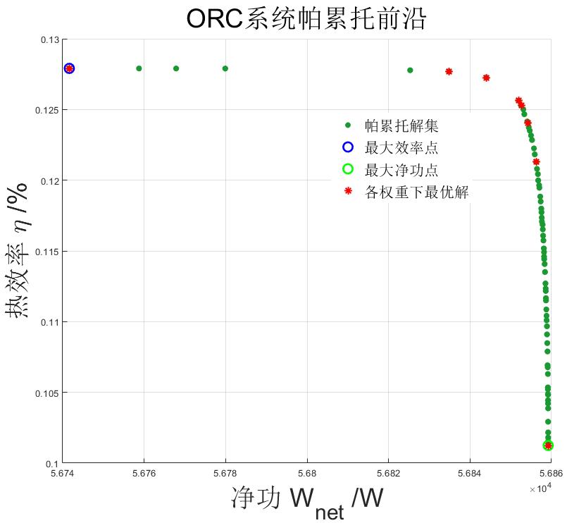 | w1 (单位净功权重) | w2 (热效率权重) | 最优点 | 单位净功 | 热效率 | F |