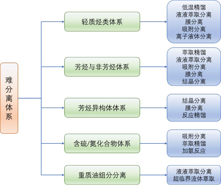 在石油化工中,分离过程是关键过程环节,且能耗占比大,其技术复杂度与效率直接决定了产品质量、能耗水平及环保性能。诸多难分离体系如芳烃与非芳烃、烯烃与烷烃等,因组分性质相近、易形成共沸物、近沸物等特性,给传统分离技术带来严峻挑战。首先系统梳理和分析了石油化工难分离体系类型及特征,并详细介绍了精馏、萃取、结晶等传统分离技术方法的应用及其局限性,探讨了离子液体萃取精馏、膜分离及吸附等新型分离技术带来的分离流程创新和过程瓶颈。并提出了面向过程低碳化绿色化要求的分离技术未来发展方向,以实现石油化工难分离体系的高效、节能、环保分离,推动石油化工行业低碳绿色可持续发展。