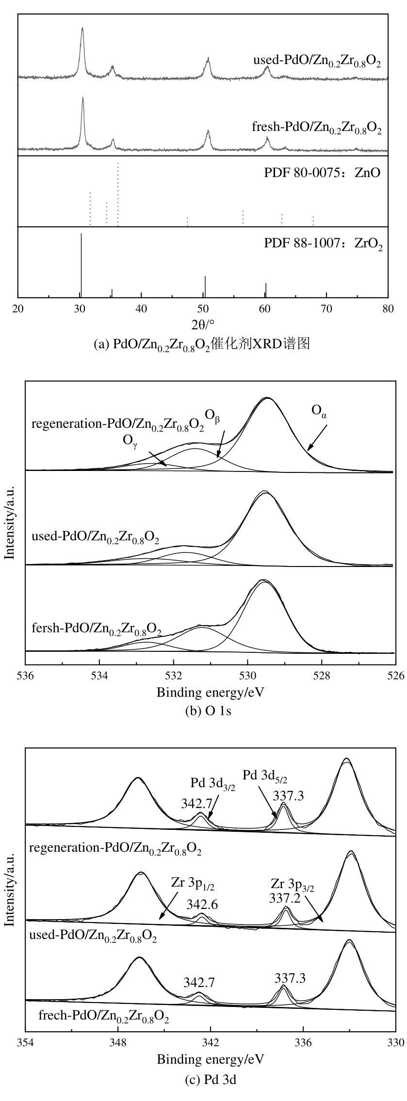 图12 使用前后及再生PdO/Zn0.2Zr0.8O2催化剂的结构表征(a) XRD谱图;(b) O 1s和(c) Pd 3d高分辨XPS谱图