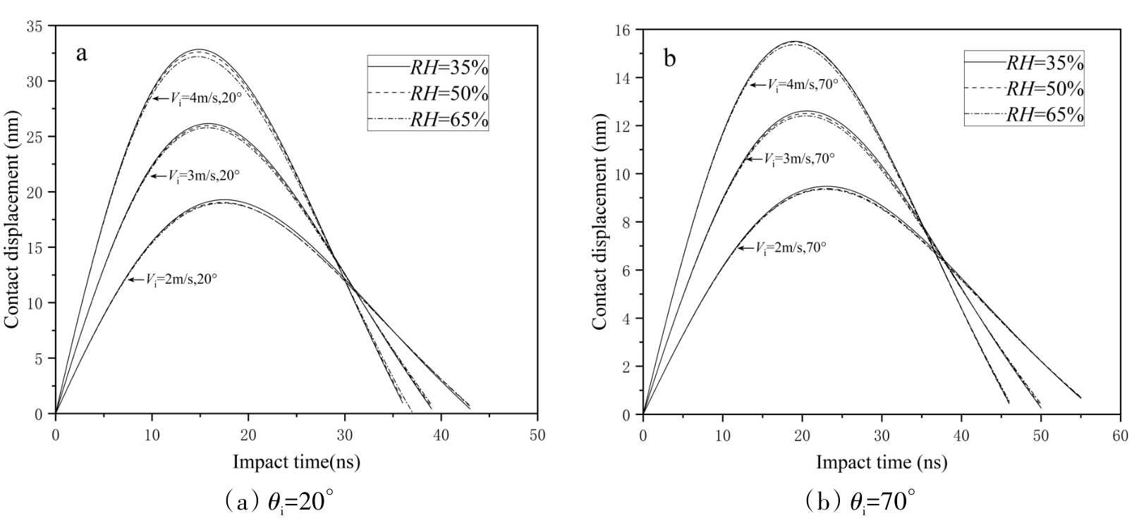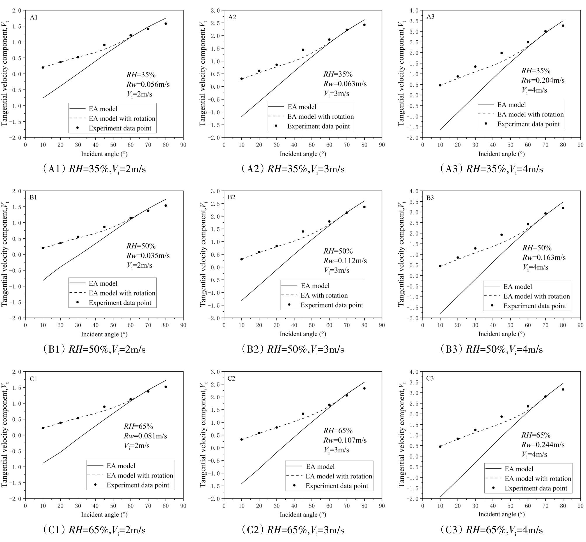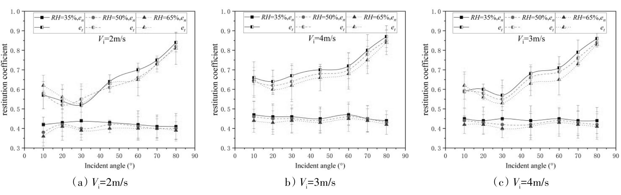 颗粒沉积广泛应用于湿法造粒、流化床包衣以及工业除尘中,明确颗粒撞击过程中的黏附机制是准确预测颗粒反弹行为的关键。然而,目前对潮湿环境下微米级颗粒和表面之间碰撞的动力学行为尚未完全明确。本研究通过实验与理论相结合的方法,系统研究了微米级SiO₂颗粒与不锈钢表面在潮湿条件下斜向撞击后的反弹行为;并构建了潮湿环境下微米级颗粒与平板碰撞的动力学模型,得到碰撞过程中颗粒动态变化过程。结果表明当入射角度从0度增加至80度时,法向恢复系数在0.35-0.5范围内波动,而切向恢复系数随入射角增加呈现先减小后增大的变化趋势。通过改进后的EA模型模拟了颗粒的撞击参数,发现随着入射速度增加以及入射角度减小,法向接触位移增大,接触时间缩短;切向位移随相对湿度(RH)的增加而减少,液桥力阻碍相对运动;随着相对湿度的增加,法向和切向接触力增大,碰撞速度减小;通过实验结果对比,发现其能准确预测颗粒的反弹行为,并且与实验结果吻合较好。