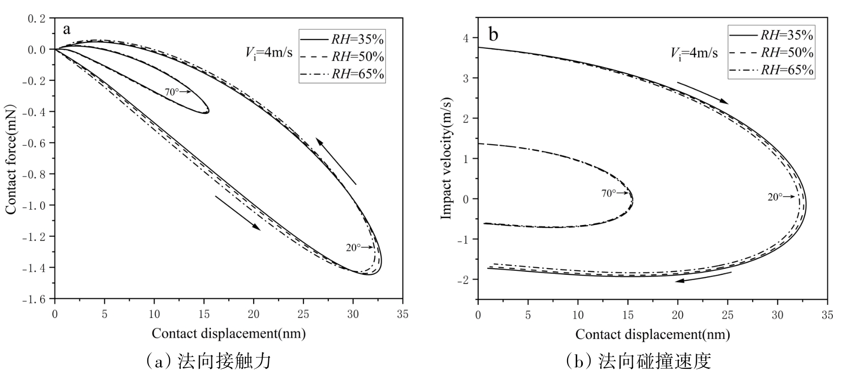 图7 不同法向入射速度下法向接触力和法向碰撞速度随法向接触位移变化