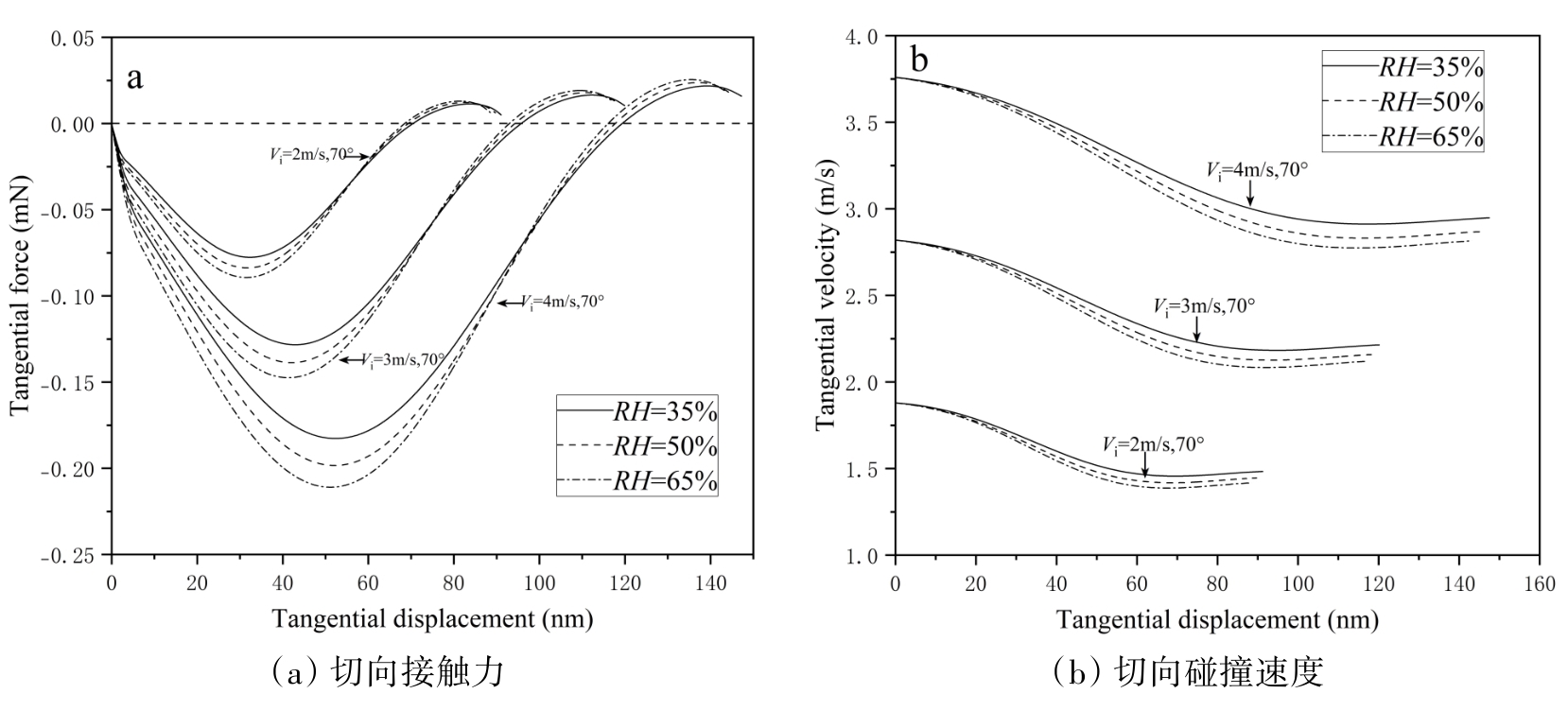 图9 不同切向入射速度下的切向接触力和切向碰撞速度随切向接触位移变化