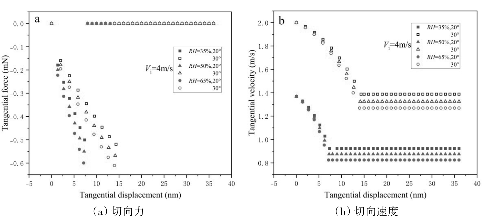 图11 不同速度下的颗粒切向力和切向速度随切向接触位移的变化
