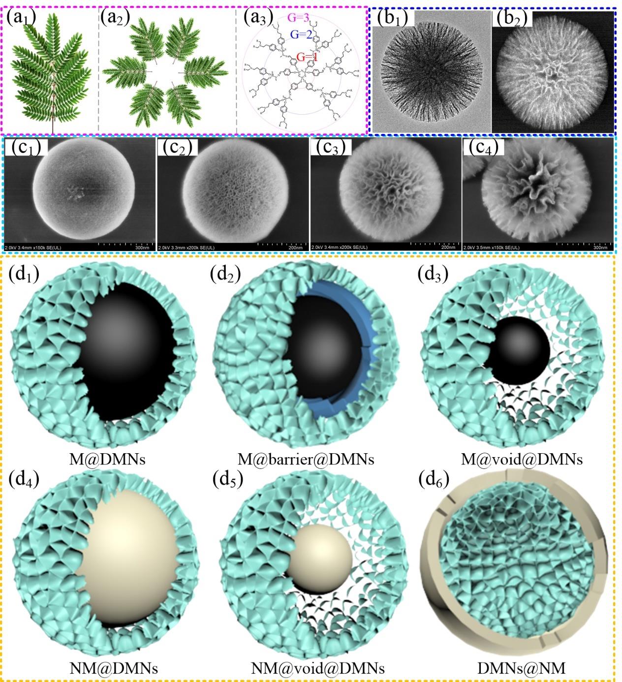 Fig.1 (a) A photograph of a tree branch in nature with “dendritic” architecture (a1); the loop of the above tree branches (a2); and a branched organic macromolecule with functional groups (a3); (b) TEM (b1) and secondary electron (SE, b2) images of a single DMSNs synthesized by our team; (c) DMSNs with small (c1); medium (c2); large (c3); and extra-large (c4) pores in our laboratory; (d) Structural models of simple dendritic magnetic core-shell M@DMNs (d1); composite dendritic magnetic core-shell M@barrier@DMNs (d2); dendritic magnetic yolk-shell M@void@DMNs (d3); as well as dendritic non-magnetic core-shell NM@DMNs (d4); non-magnetic yolk-shell NM@void@DMNs (c5); and non-magnetic core-shell DMNs@NM (d6)