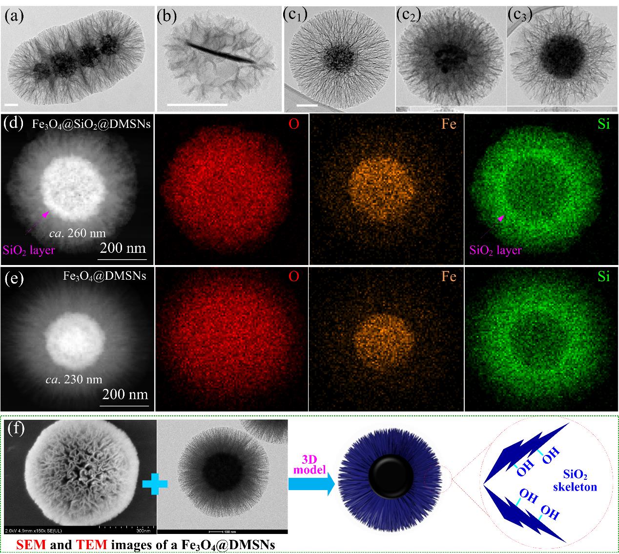 Fig.2 (a) TEM images of magnetic core-shell DMSNs with chainlike (a); disclike (b); and spherical (c) cores; but in forms of small (c1); medium (c2); and large (c3) pores[22]; (d) TEM mapping images of a Fe3O4@SiO2@DMSNs in our laboratory; (e) TEM mapping images of a Fe3O4@DMSNs in our laboratory; (f) A three-dimensional model of a Fe3O4@DMSNs extracted by its SEM and TEM images