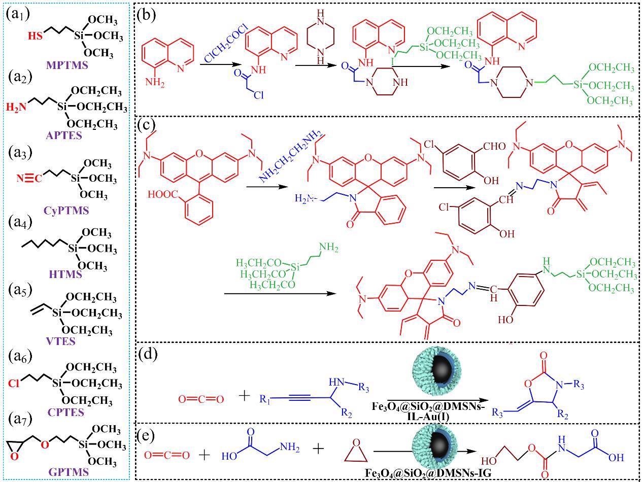 Fig.3 (a) Normal silane coupling agents for functionalization of dendritic magnetic core-shell nanoreactors; including 3-mercaptopropyltrimethoxysilane (a1); 3-aminopropyltriethoxysilane (a2); 3-cyanopropyltrimethoxysilane (a3); hexyltrimethoxysilane (a4); vinyltriethoxysilane (a5); 3-chloropropyltriethoxysilane (a6); and 3-glycidoxypropyltriethoxysilane (a7); (b) The synthesis route of a novel silane molecule containing 8-aminoquinoline functional group; (c) The synthesis route of a novel silane molecule containing rhodamine B functional group; (d) Synthesis of 2-oxazolidinone with propargylic amines and CO2 catalyzed by Fe3O4@SiO2@DMSNs-IL-Au(I) nanoreactor; (e) Synthesis of N-[(2-hydroxyethoxy)carbonyl]glycine with CO2; α-amino acid, and ethylene oxide catalyzed by Fe3O4@SiO2@DMSNs-IG nanoreactor