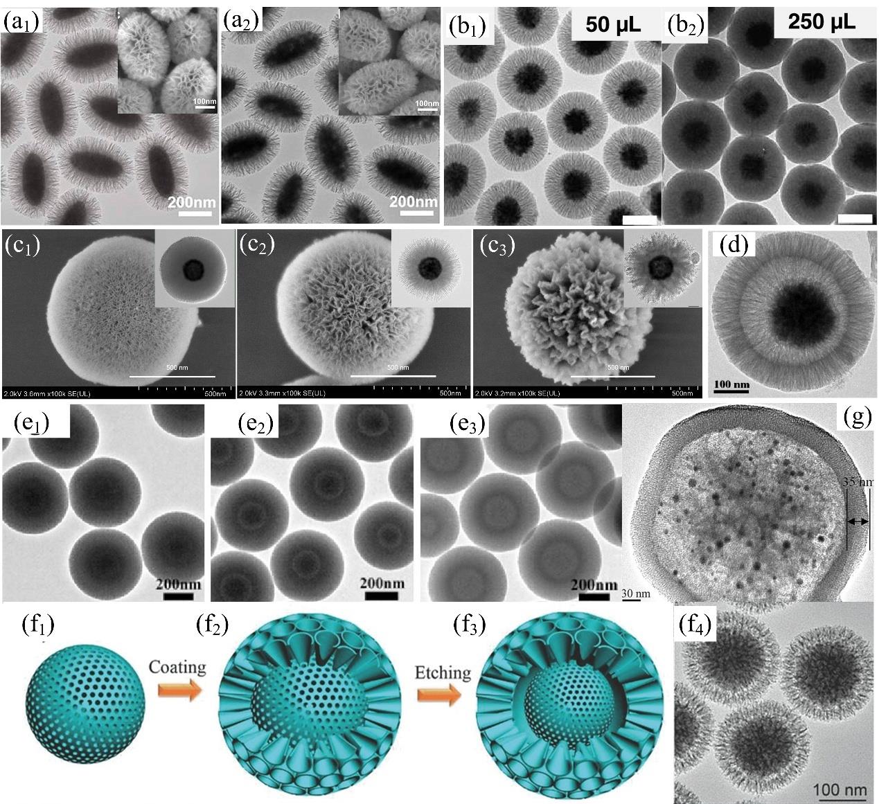 图4 (a) 椭圆形树枝状核壳结构的透射和扫描电镜图;包括Fe2O3@DMSNs(a1)和Fe3O4@DMSNs(a2)[65];(b) 通过调节TEOS添加量制得不同粒径和孔密度SPION@DMSNs的透射电镜图[66];(c) 本文作者课题组制得具有10、25和60 nm孔径Fe3O4@DMSNs-OTES的透射和扫描电镜图;(d) 蛋黄-蛋壳结构Fe3O4@SiO2@void@DMSNs的透射电镜图[17];(e) 一锅自模板界面扩散法制得核壳、蛋黄-蛋壳和空心结构DMSNs的透射电镜图[71];(f) 蛋黄-蛋壳型MONs@void@DMONs的合成示意图及其透射电镜图[73];(g) DMSNs为中心核制备得 (DMSNs-APTES-Au)@void@MSNs的透射电镜图[74]