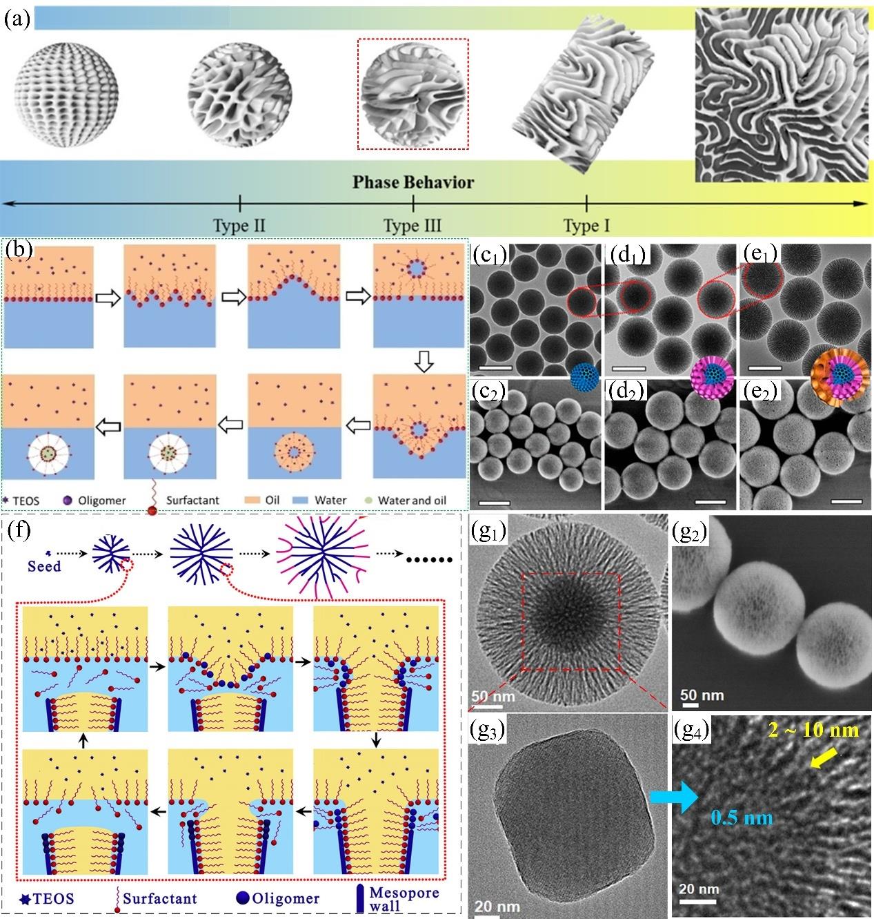 图5 (a) 具有不同相行为和微结构的水-表面活性剂-油三相系统[76];(b) 扰动界面形成SiO2@DMSNs机制示意图[77];(c)DMSNs;(d)DMSNs@DMSNs和(e)DMSNs@DMSNs@DMSNs;纳米颗粒的透射(c1-e1);扫描(c2-e2)电镜图及三维模型图[79];(f) 双相分层法合成DMSNs的界面增长机制[79];(g) ZeoA@DMSNs 的透射(g1)和扫描(g2)电镜图。ZeoA (g3) 以及ZeoA核-DMSNs 壳交汇界面(g4) 的透射电镜图[98]