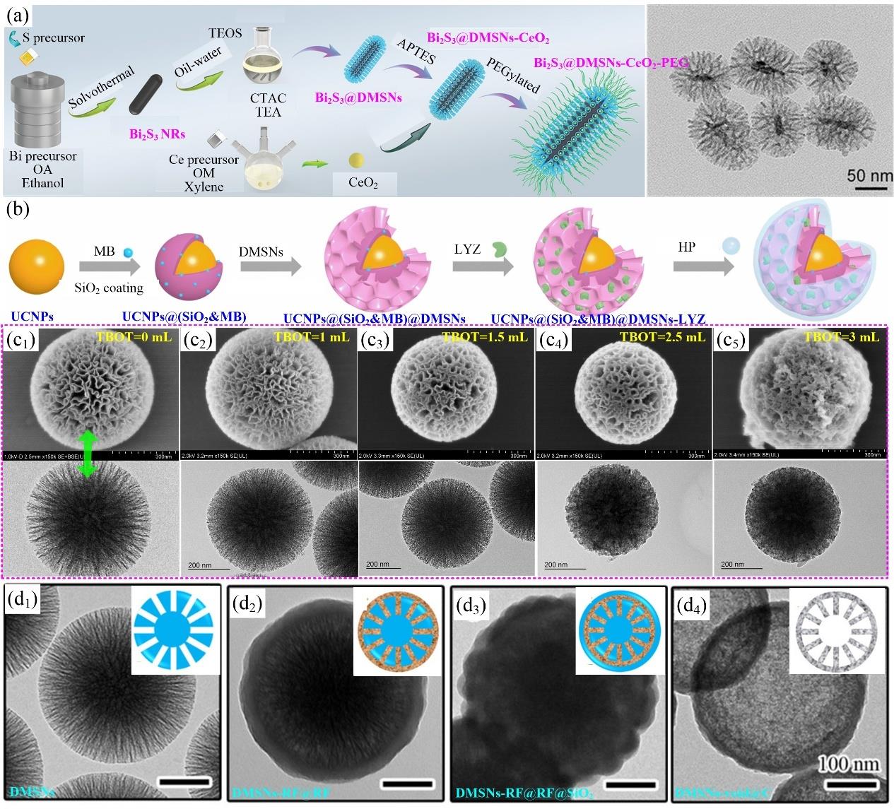 Fig.6 (a) Schematic illustration of synthetic procedure for ellipsoidal Bi2S3@DMSNs-CeO2-PEG[117]; (b) Schematic illustration of synthetic route for UCNPs@(SiO2&MB)@DMSNs-LYZ@HP[125]; (c) TEM and SEM images of various DMSNs-TiO2 composites in our laboratory by adjusting TBOT dosage from 0 to 3 mL; (d) TEM and inserted illustration images of involved nanoparticles towards DMSNs-void@C; including DMSNs (d1); DMSNs-RF@RF (d2); DMSNs-RF@RF@SiO2 (d3) and DMSNs-void@C (d4) [130]