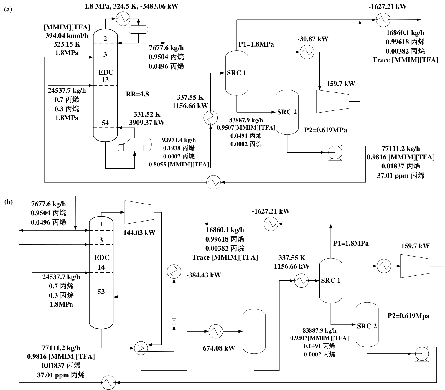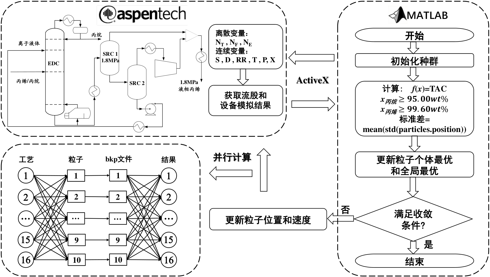 丙烯/丙烷作为近沸难分离物系,现有精馏技术存在高能耗和高设备投资等问题。离子液体可忽略的挥发特性及强作用力属性,使得其在分离近沸物系方面得到了广泛研究。因此,本研究通过多尺度模拟,分析了离子液体强化丙烯/丙烷的微观机制及工艺性能。研究提出了一种基于MATLAB平台的计算机辅助离子液体设计与工艺并行优化的集成策略,采用基团贡献法和生成测试的求解策略进行离子液体设计。基于多粒子并行的粒子群优化方法对多种进料工况和多种离子液体工艺进行并行优化。结果表明,[MMIM][TFA]强化丙烯/丙烷分离的机理是离子液体与丙烯间的π-π、C-H···π和π···H···O相互作用,离子液体与丙烯的静电作用力强于与丙烷的静电作用力,从而显著提高了丙烯/丙烷的选择性。与热泵精馏及ACN水溶液萃取精馏相比,[MMIM][TFA]萃取精馏节能工艺的年总成本分别降低了38.26%~45.45%和24.04%~40.07%。